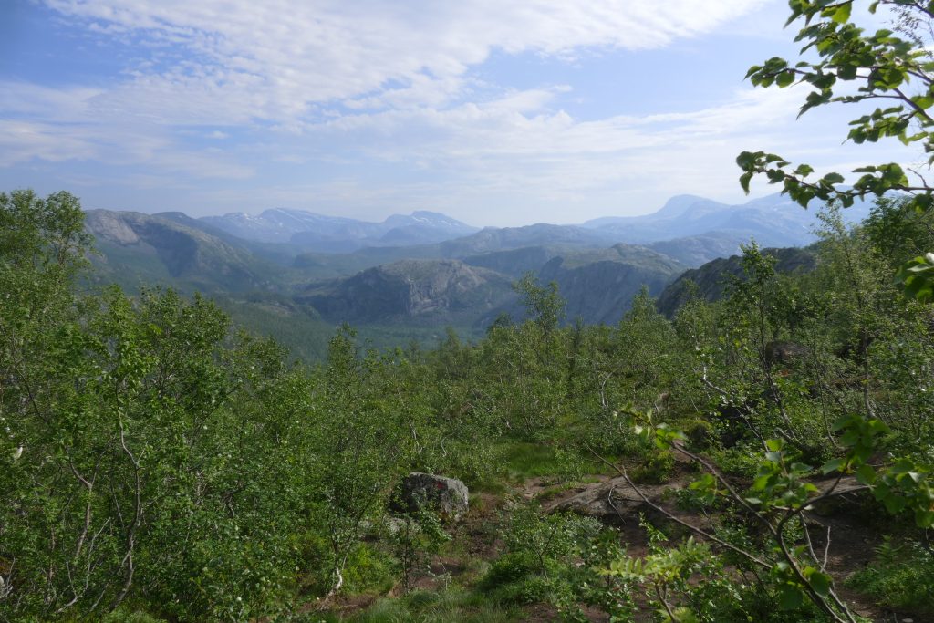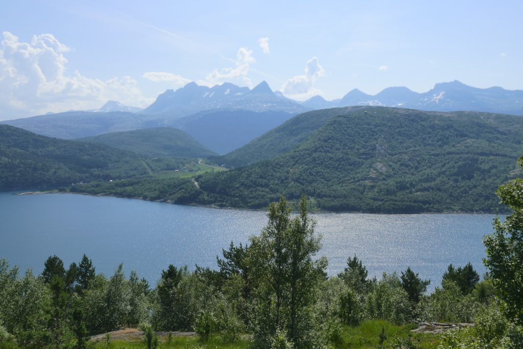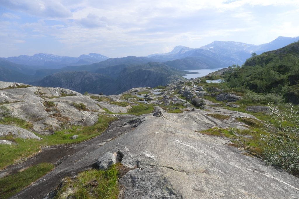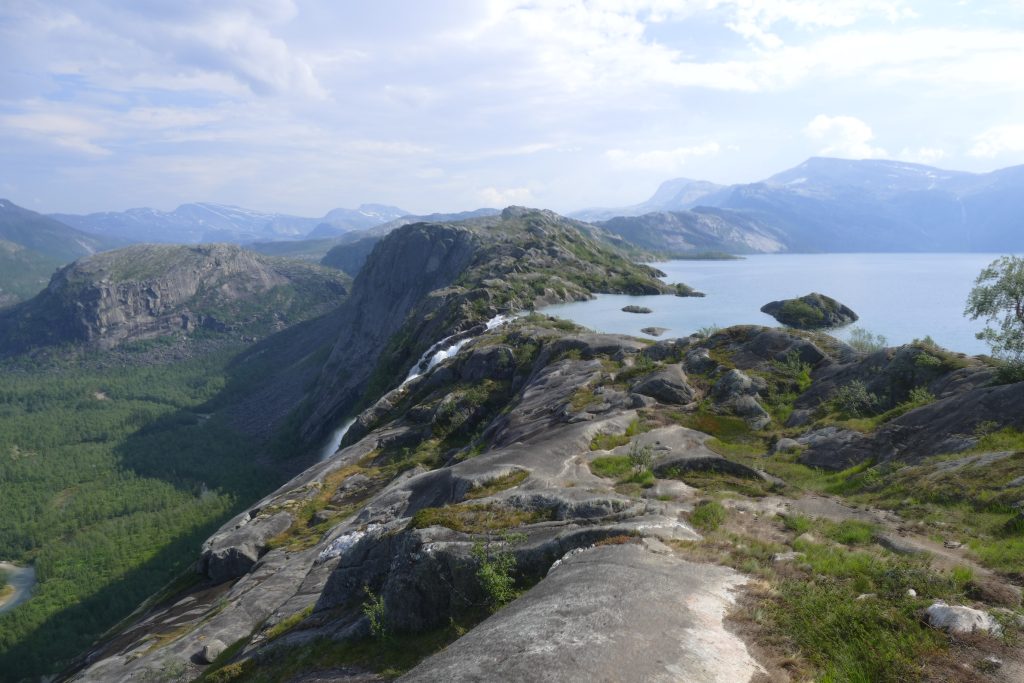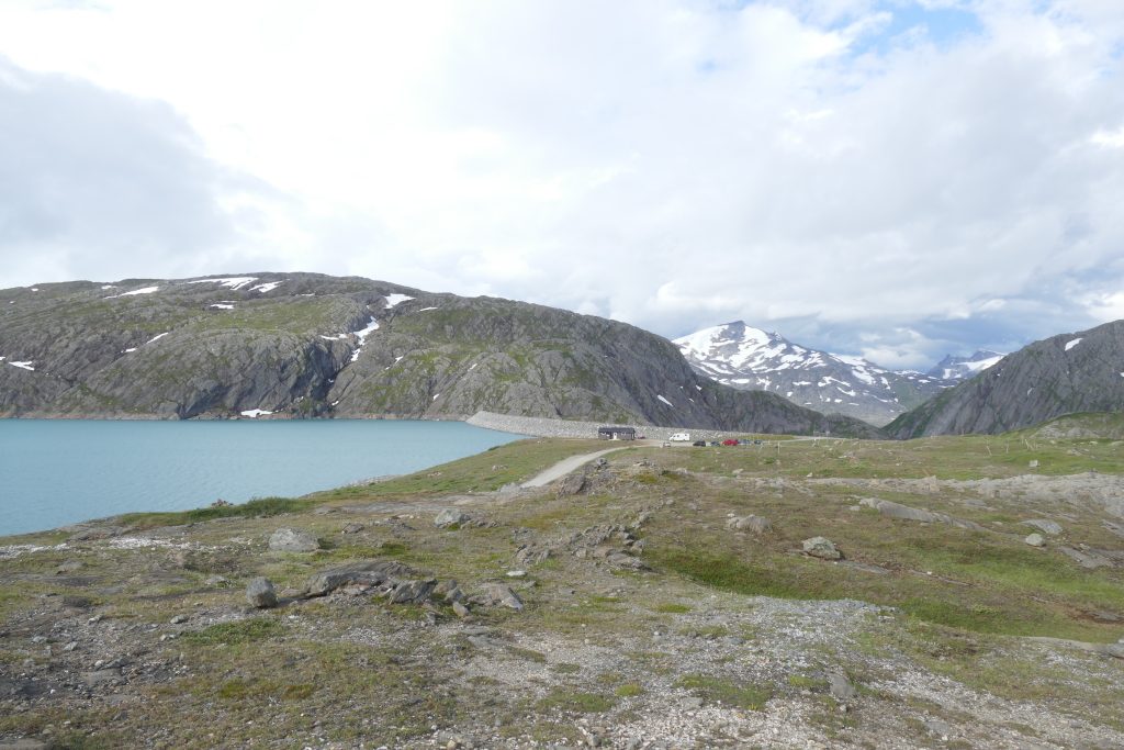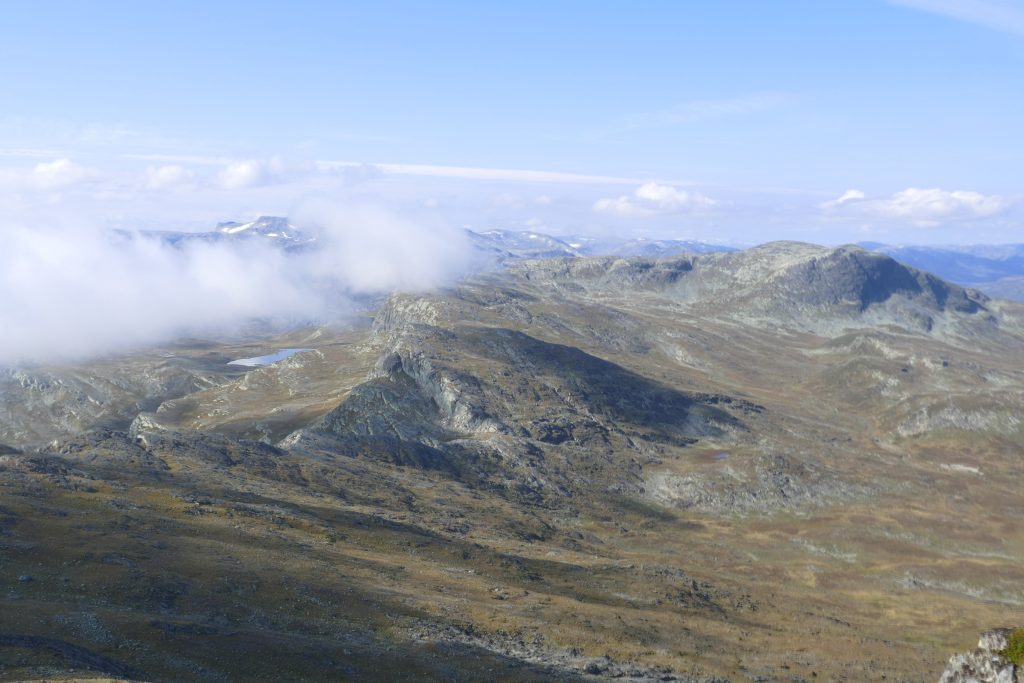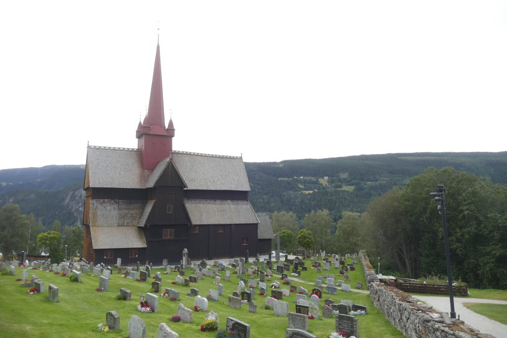 Am Morgen sind wir in den Wolken, als wir weiter in Richtung Süden fahren. Schon bald lichten sich die Wolken und geben den Blick auf die grandiose Landschaft frei. Wir wollen heute auf den 1607 m hohen Bitihorn wandern. Doch es gibt keinen geeigneten Parkplatz am Ausgangspunkt der Wanderung und der Berggipfel versteckt sich noch. So fahren wir ein Stück weiter und sehen ein Schild mit der Aufschrift Bitihødntrøppe. Einen ca. 1,8 km langen Aufstieg über 460 Höhenmeter auf den Bitihorn über Sherpatreppen. Kurz entschlossen machen wir uns auf den Weg. Es ist nicht ganz einfach den richtigen Weg zu finden, da das Gelände zum Teil stark erodiert ist. Doch schließlich sind wir auf dem Gipfel mit grandioser Aussicht auf die Zweitausender des Jotunheimen Nationalpark. Unter uns die blauen Seen und die Sonne hat alle Wolken weggefegt. Dann fahren wir ein Stück weiter nach Breitostølen, wo wir einkaufen und nach der nächsten Apotheke fragen. 40 km in südliche Richtung, 200 km zum nächsten Krankenhaus – erfahren wir. Wir sehen uns unterwegs die Hegge Stavkirke an und fahren nach Fragenes. Hier kann uns nicht geholfen werden, wir sollen bis Hønefoss fahren. Unterwegs biegen wir von der E16 ab auf die 33, die als landschaftlich schöne Straße ausgewiesen ist und parken bei Bjørgo.