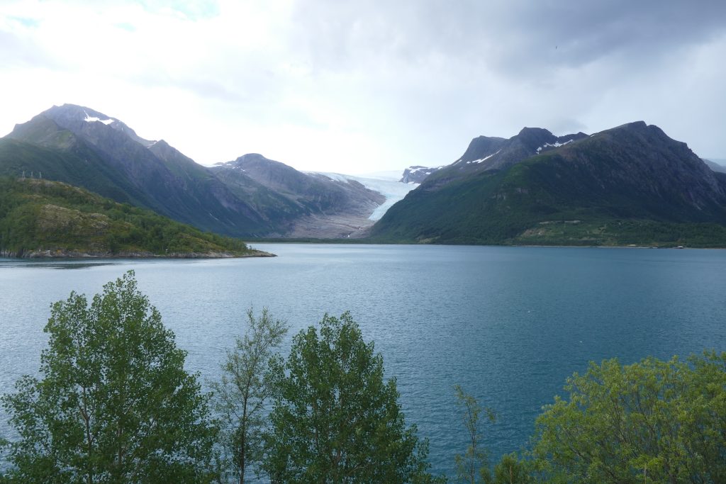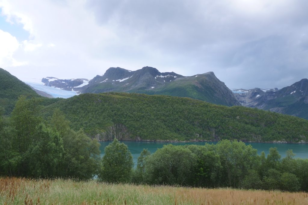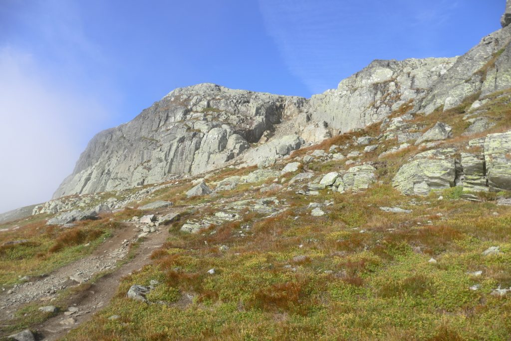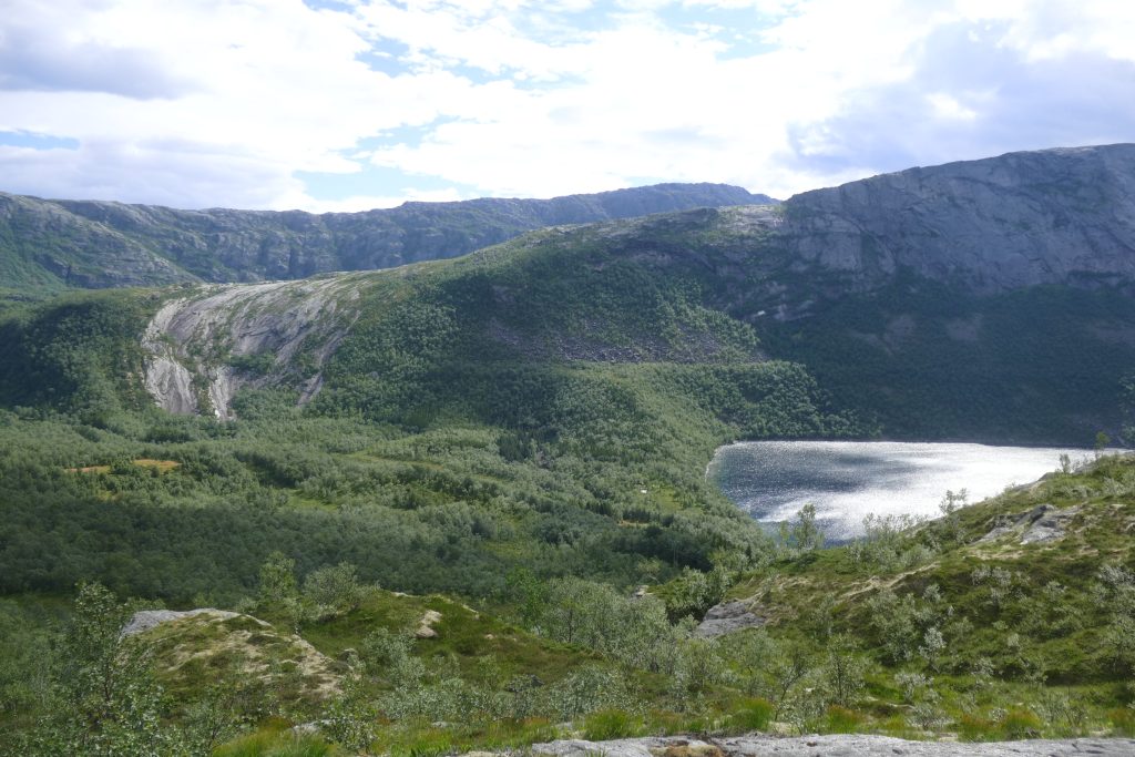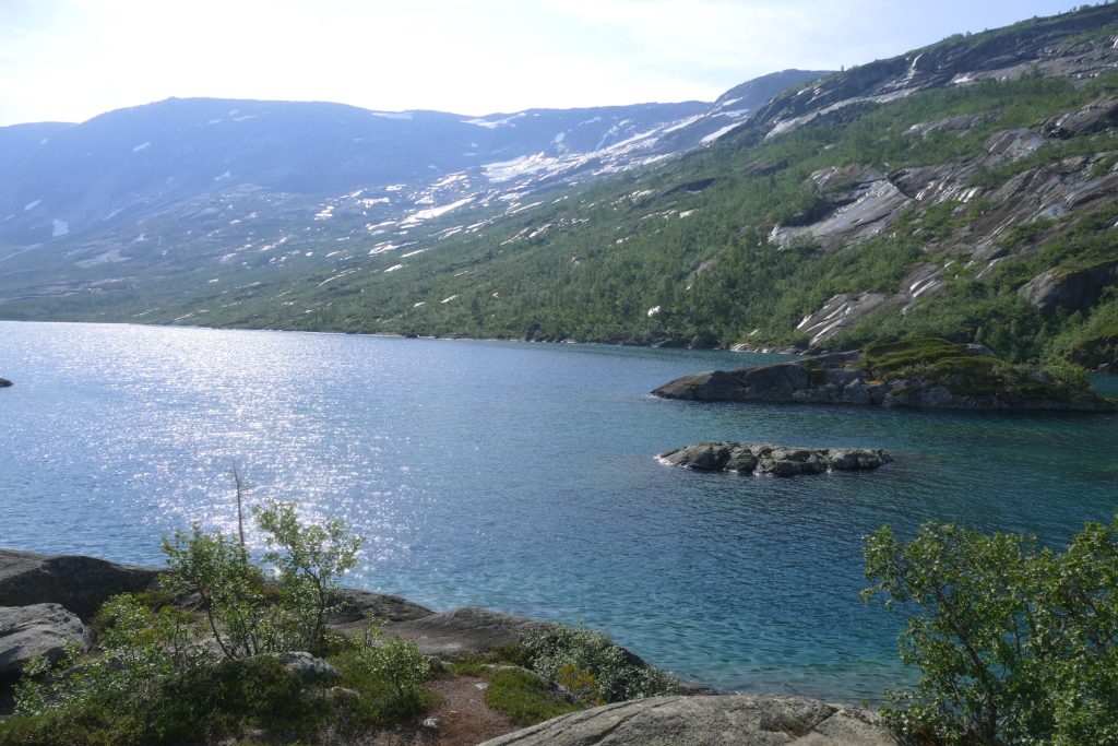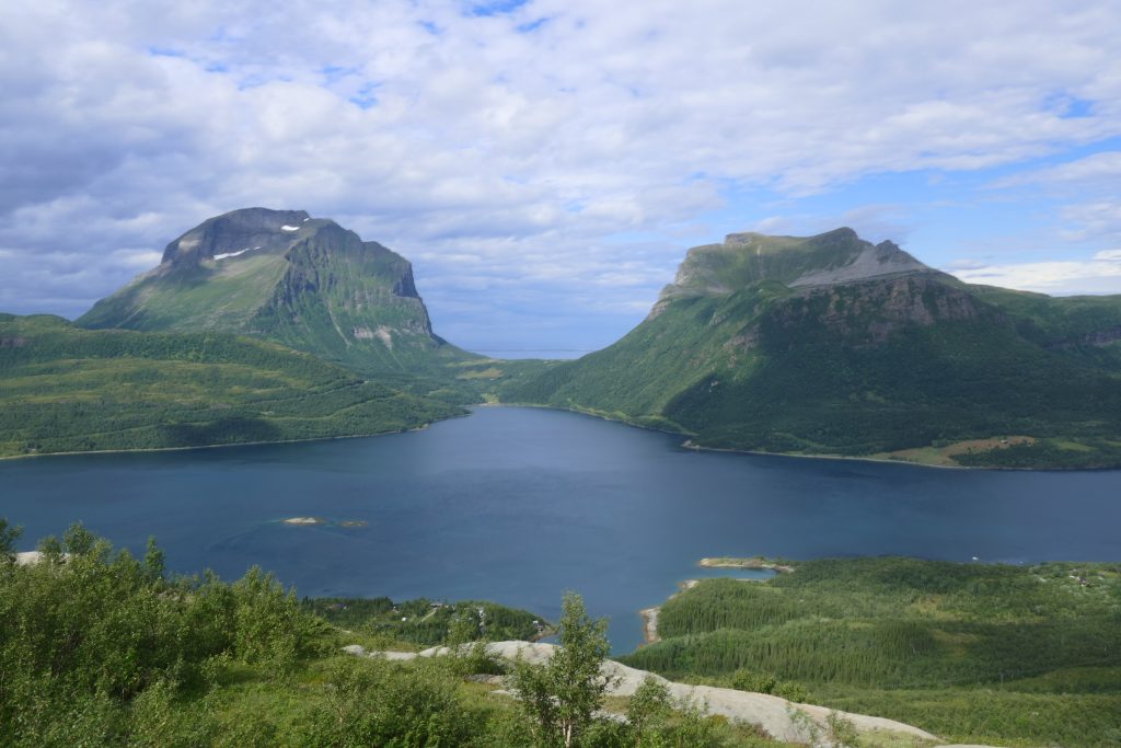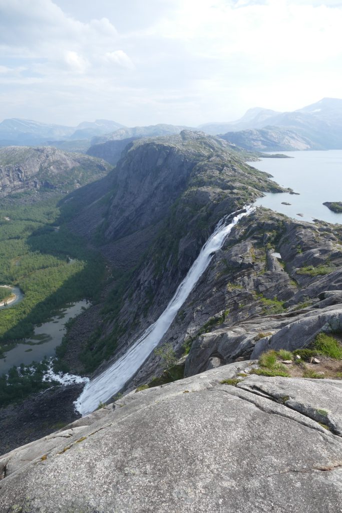 Am Morgen sind wir in den Wolken, als wir weiter in Richtung Süden fahren. Schon bald lichten sich die Wolken und geben den Blick auf die grandiose Landschaft frei. Wir wollen heute auf den 1607 m hohen Bitihorn wandern. Doch es gibt keinen geeigneten Parkplatz am Ausgangspunkt der Wanderung und der Berggipfel versteckt sich noch. So fahren wir ein Stück weiter und sehen ein Schild mit der Aufschrift Bitihødntrøppe. Einen ca. 1,8 km langen Aufstieg über 460 Höhenmeter auf den Bitihorn über Sherpatreppen. Kurz entschlossen machen wir uns auf den Weg. Es ist nicht ganz einfach den richtigen Weg zu finden, da das Gelände zum Teil stark erodiert ist. Doch schließlich sind wir auf dem Gipfel mit grandioser Aussicht auf die Zweitausender des Jotunheimen Nationalpark. Unter uns die blauen Seen und die Sonne hat alle Wolken weggefegt. Dann fahren wir ein Stück weiter nach Breitostølen, wo wir einkaufen und nach der nächsten Apotheke fragen. 40 km in südliche Richtung, 200 km zum nächsten Krankenhaus – erfahren wir. Wir sehen uns unterwegs die Hegge Stavkirke an und fahren nach Fragenes. Hier kann uns nicht geholfen werden, wir sollen bis Hønefoss fahren. Unterwegs biegen wir von der E16 ab auf die 33, die als landschaftlich schöne Straße ausgewiesen ist und parken bei Bjørgo.
