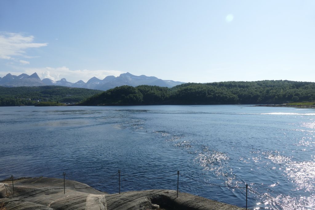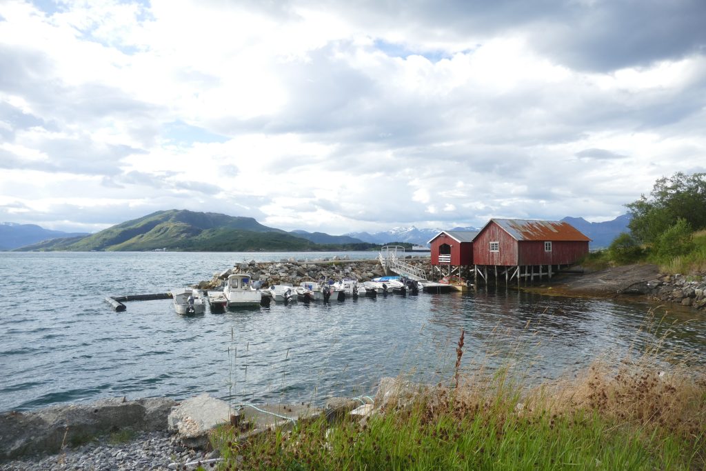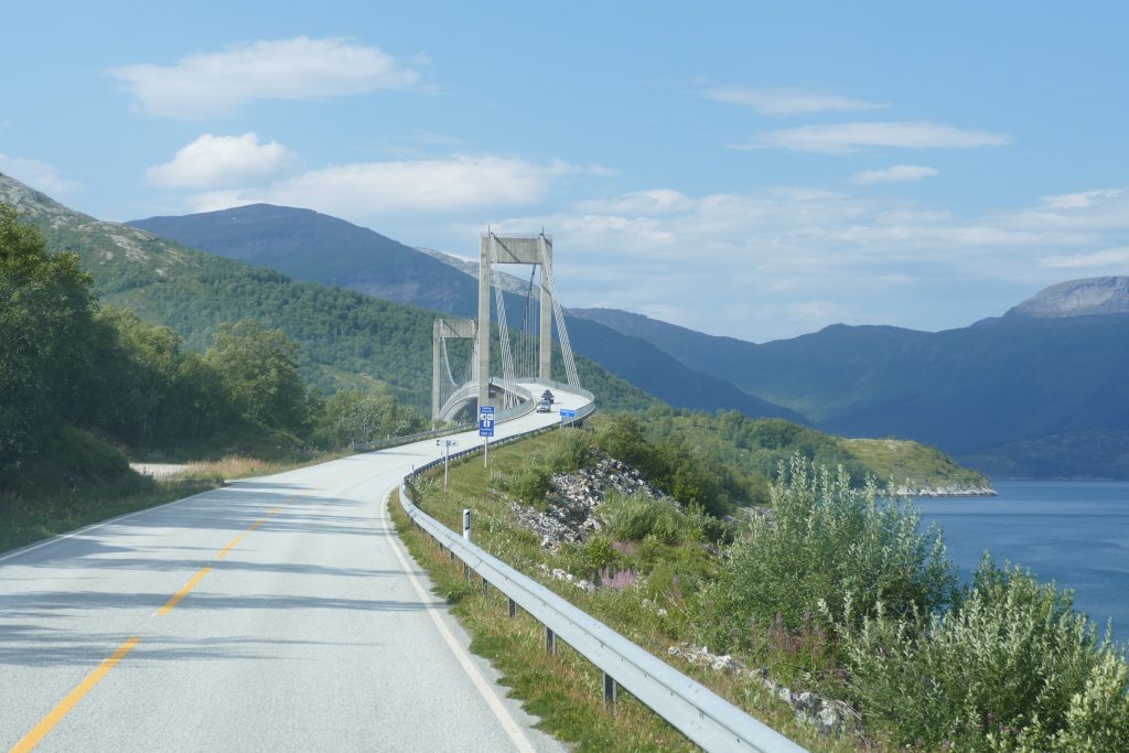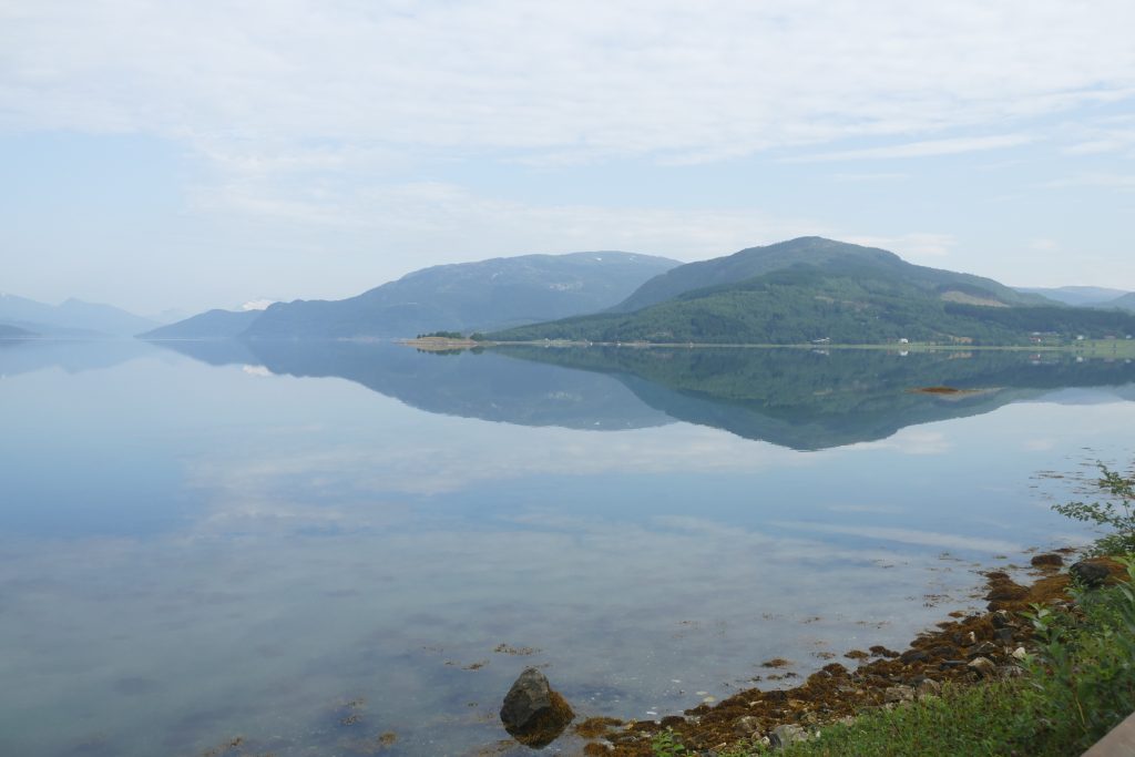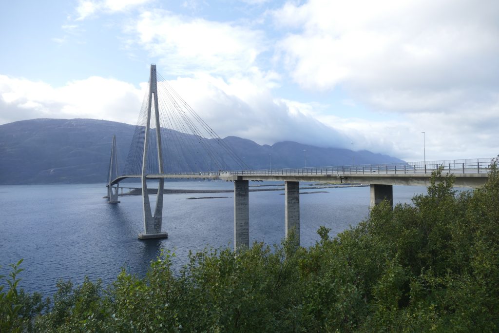 Über dem Trondheimsforden liegt Nebel und Sprühregen. Trondheim auf der gegenüberliegenden Seite ist nicht mehr zu sehen. Wir fahren zur Fähre Rørvik nach Flakk und setzten über. Wir umfahren Trondheim auf der 707 entlang von Feldern und kleinen Bauernhöfen. In Klett biegen wir auf die E39 und schon folgen jede Menge Tunnel bis Orkanger. Wir bleiben auf der E39 bis zur nächsten Fähre von Halsa nach Kanestraum. Kurz danach biegen wir auf die 70 in Richtung Kristiansund ab. Mittlerweile hat es aufgehört zu regnen. Wir fahren noch bis auf die Insel Bergsøya, wo wir direkt an der Gjemnessund-Brücke über den Gjemnessundet parken. Den Nachmittag nutzen wir für unsere weitere Planung der Reise.