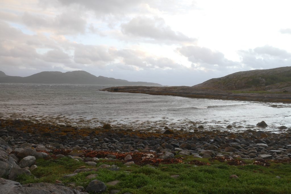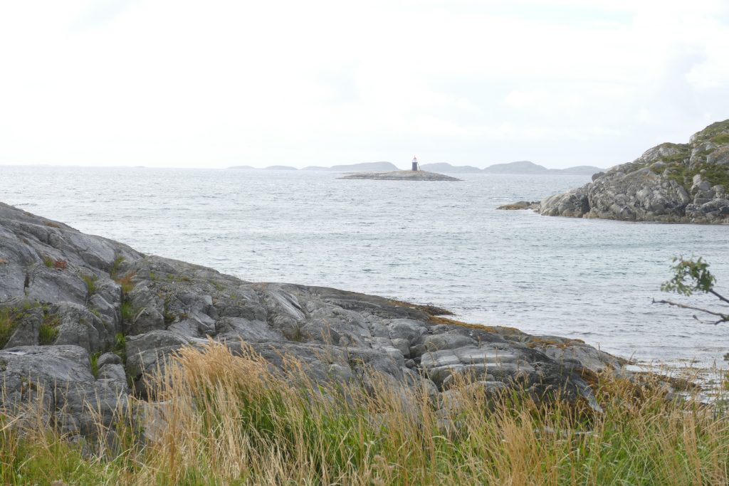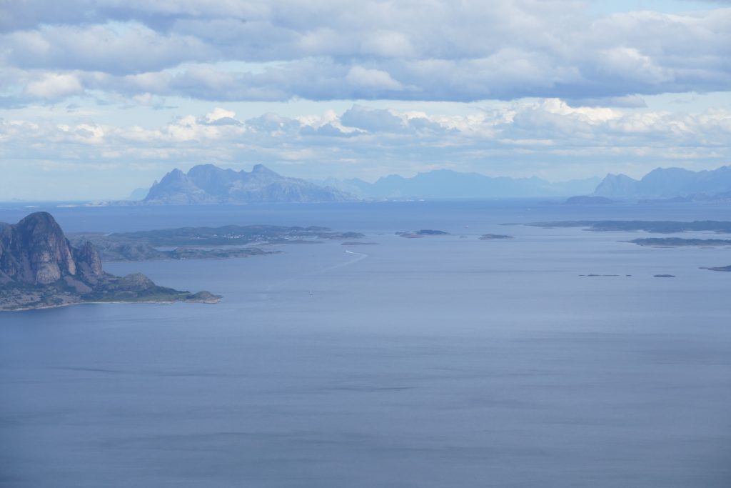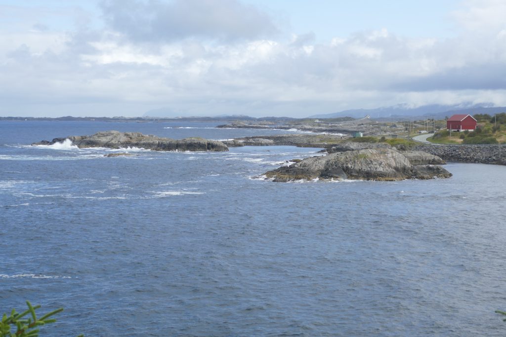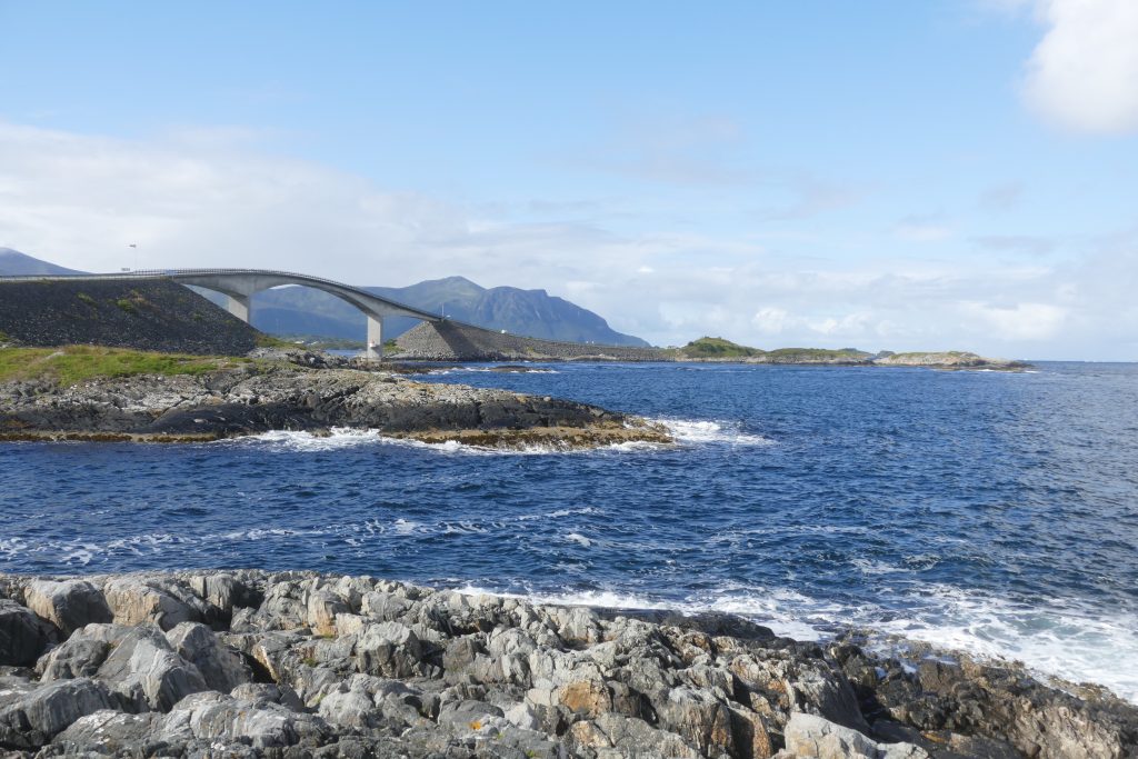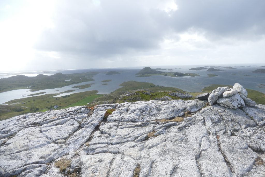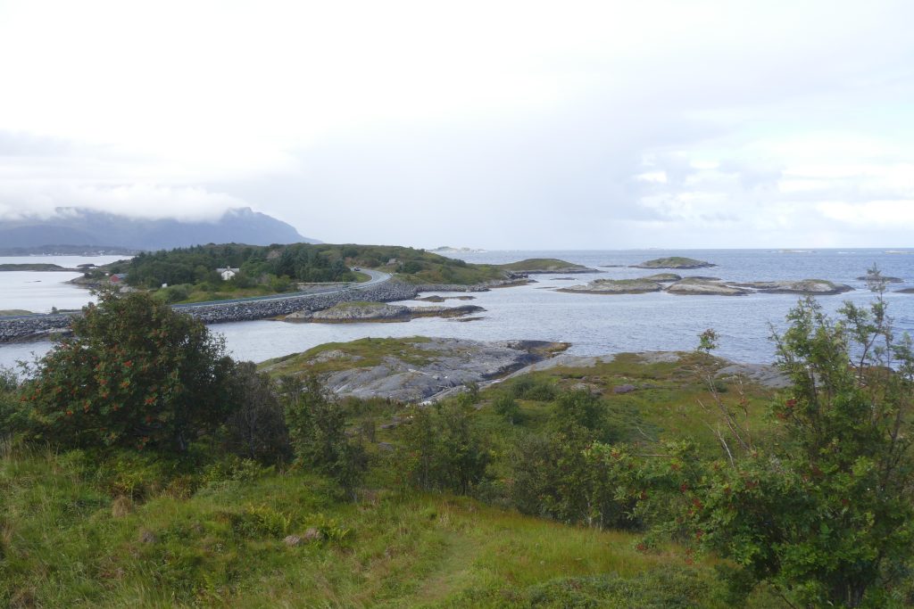 Regen, Regen und noch mehr Regen. Einen kurzen Moment haben wir am Morgen die Hoffnung, dass es sich bessert. Doch nein, wir gehen nicht auf den Meekknoken, der sich in Wolken hüllt. Die steile Abfahrt ist nun zu bewältigen. Wir fahren weiter um die Insel Averøy bis nach Kårvåg und zum ersten Rastplatz auf dem Atlanterhavsvegen, eine der atemberaubendsten Straßen der Welt. An der Geitøy-Brücke haben wir einen schönen Panoramablick auf den Schärengarten. Ein Angelsteg führt unter die Brücke, wo gerade das Wasser mit mächtigen Strudeln in den Atlantik zurückfließt. Sonne und Regen wechseln sich heute ständig ab. Ein Höhepunkt des Atlanterhavsvegen ist die Storseisundrua die größte und beeindruckendste der 8 Brücken auf der Landschaftsroute, die sich wie verdreht zwischen die Inseln zwängt. Auf der Insel Eldhusøya nehmen wir den Aussichtsweg, der entlang der Küste führt. Zu beiden Seiten der Myrbærholmbrua wurden Angelerstege eingerichtet. Wir gehen hinunter zu den Klippen und sehen den Anglern zu, wie sie im starken Gezeitenstrom Dorsch, Pollack, Makrele und Seelachs aus dem Meerwasser holen. Hier muss auch ein altes Schiffswrack liegen, doch finden wir den Parkplatz mit der Aussicht darauf nicht. Wir fahren noch ein Stück weiter zum nächsten Rastplatz, Hågå in Vevang, wo wir den Küstenwanderweg mit den Teilen von weißen Säule laufen. Wie zufällig angespült liegen die Teile der griechischen Säulen zwischen den Klippen. Die Landschaftsroute verläuft weiter entlang von Küstenkulturlandschaften und hügeligen Heidelandschaften bis zu den kahlen Bergkuppen am rauen, offenen Küstenabschnitt Hustadvika. Hier befindet sich der Rastplatz Farstadsanden mit den nördlichsten Dünen der Welt und einer geschützten Sanddünenlandschaft. Wir nehmen den Weg am Strand entlang und folgen der Küstenlinie bis zum Leuchtturm Nordneset. Im Anschluss fahren wir ca. 6 km zurück zu einem kleinen Parkplatz mit schöner Aussicht auf die Schären in der Nähe unseres morgigen Wanderziels.