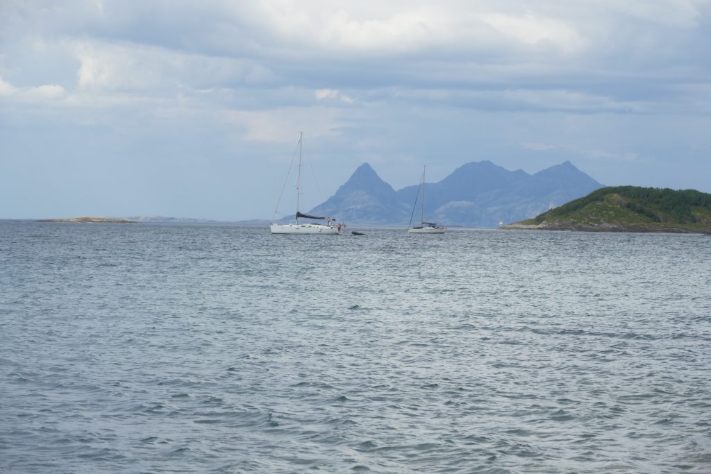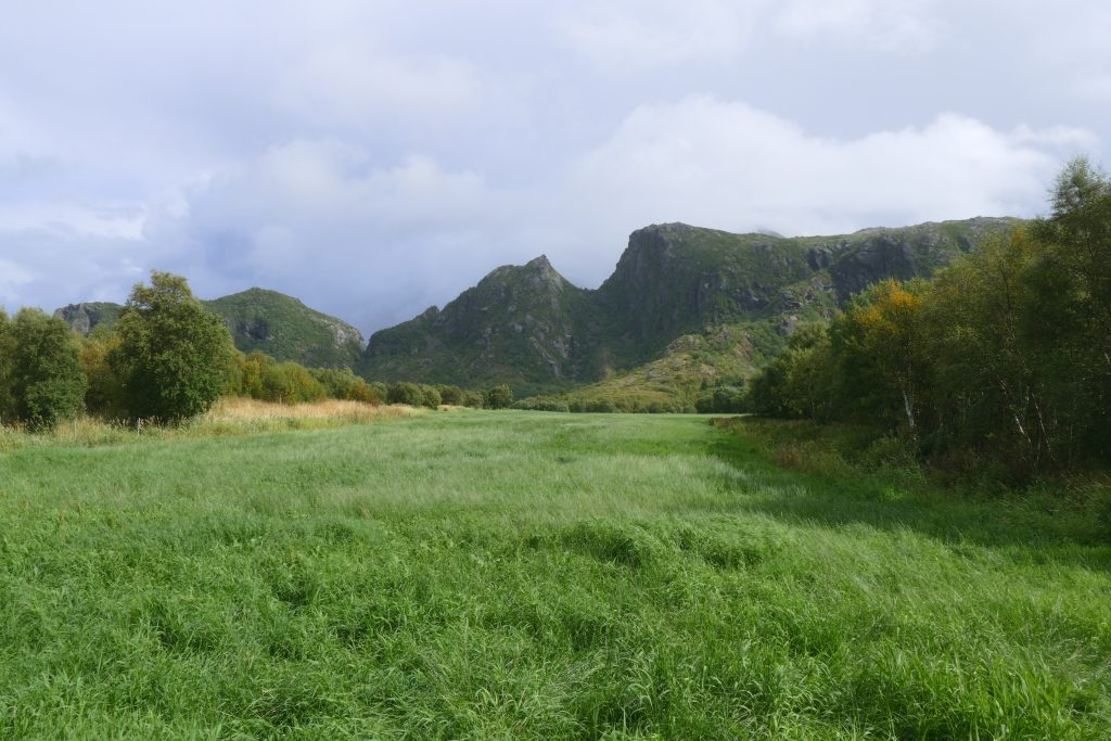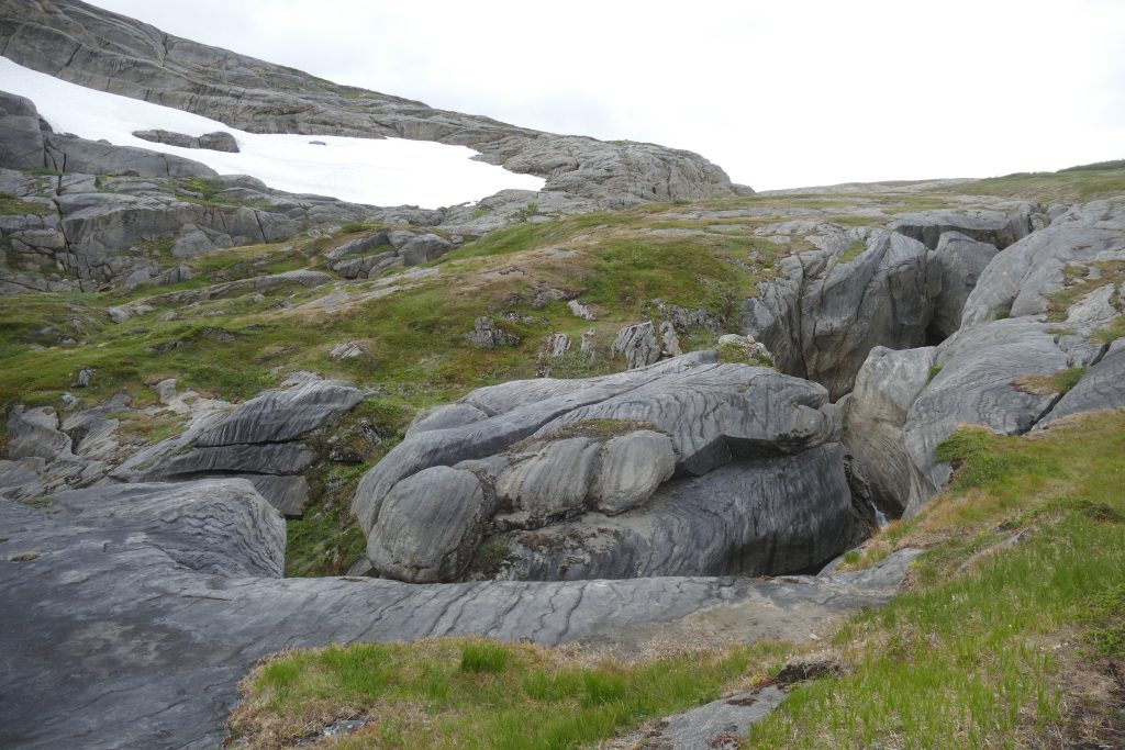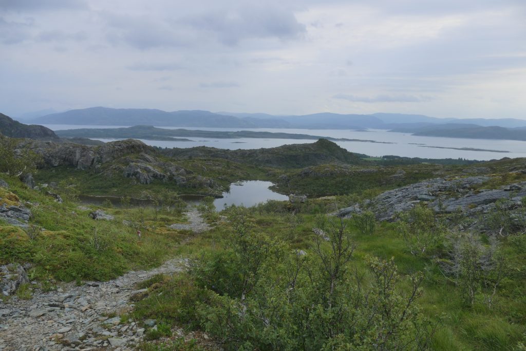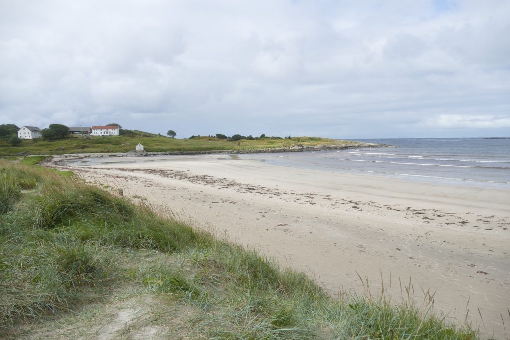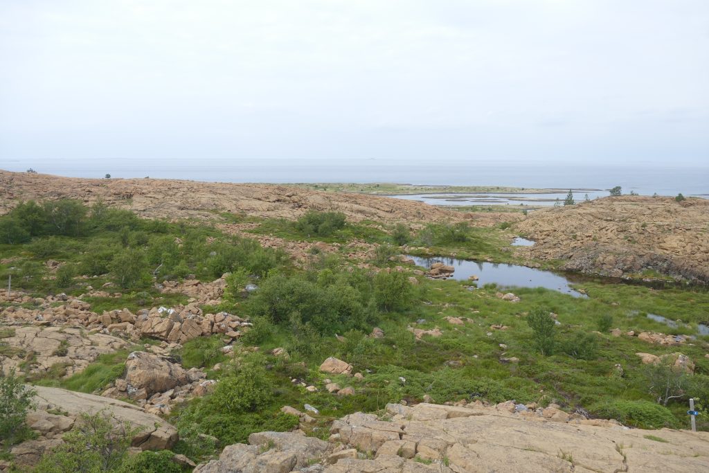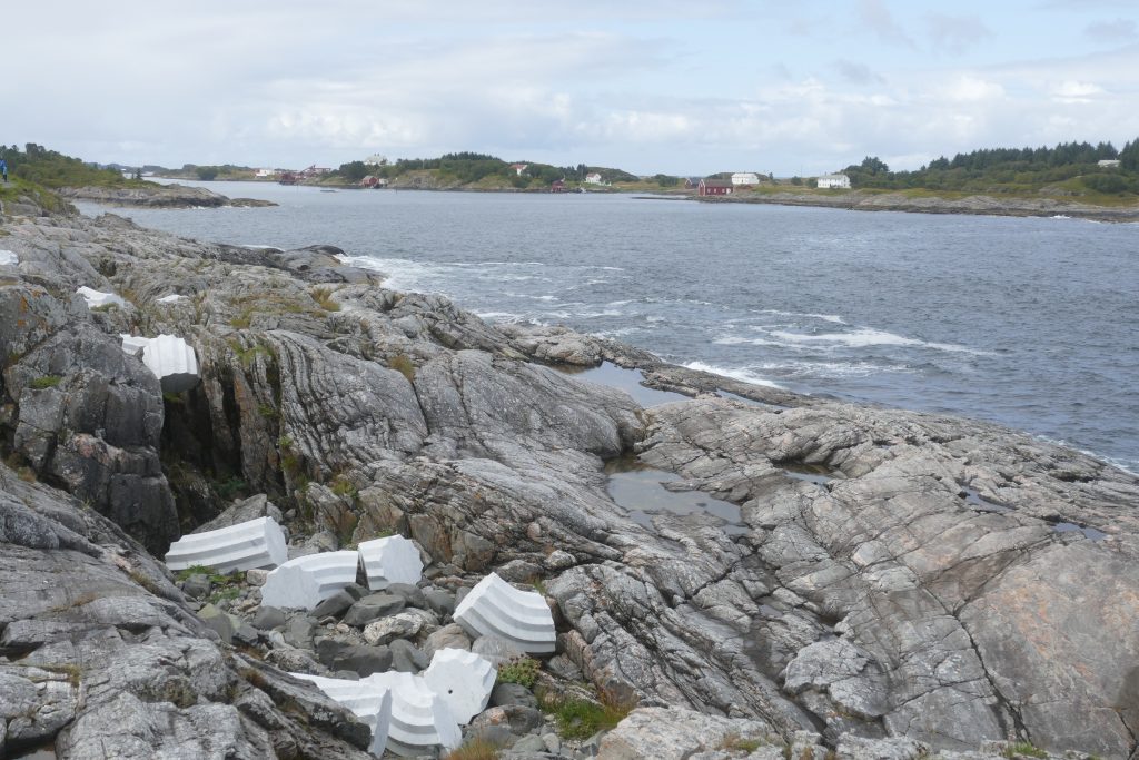 Regen, Regen und noch mehr Regen. Einen kurzen Moment haben wir am Morgen die Hoffnung, dass es sich bessert. Doch nein, wir gehen nicht auf den Meekknoken, der sich in Wolken hüllt. Die steile Abfahrt ist nun zu bewältigen. Wir fahren weiter um die Insel Averøy bis nach Kårvåg und zum ersten Rastplatz auf dem Atlanterhavsvegen, eine der atemberaubendsten Straßen der Welt. An der Geitøy-Brücke haben wir einen schönen Panoramablick auf den Schärengarten. Ein Angelsteg führt unter die Brücke, wo gerade das Wasser mit mächtigen Strudeln in den Atlantik zurückfließt. Sonne und Regen wechseln sich heute ständig ab. Ein Höhepunkt des Atlanterhavsvegen ist die Storseisundrua die größte und beeindruckendste der 8 Brücken auf der Landschaftsroute, die sich wie verdreht zwischen die Inseln zwängt. Auf der Insel Eldhusøya nehmen wir den Aussichtsweg, der entlang der Küste führt. Zu beiden Seiten der Myrbærholmbrua wurden Angelerstege eingerichtet. Wir gehen hinunter zu den Klippen und sehen den Anglern zu, wie sie im starken Gezeitenstrom Dorsch, Pollack, Makrele und Seelachs aus dem Meerwasser holen. Hier muss auch ein altes Schiffswrack liegen, doch finden wir den Parkplatz mit der Aussicht darauf nicht. Wir fahren noch ein Stück weiter zum nächsten Rastplatz, Hågå in Vevang, wo wir den Küstenwanderweg mit den Teilen von weißen Säule laufen. Wie zufällig angespült liegen die Teile der griechischen Säulen zwischen den Klippen. Die Landschaftsroute verläuft weiter entlang von Küstenkulturlandschaften und hügeligen Heidelandschaften bis zu den kahlen Bergkuppen am rauen, offenen Küstenabschnitt Hustadvika. Hier befindet sich der Rastplatz Farstadsanden mit den nördlichsten Dünen der Welt und einer geschützten Sanddünenlandschaft. Wir nehmen den Weg am Strand entlang und folgen der Küstenlinie bis zum Leuchtturm Nordneset. Im Anschluss fahren wir ca. 6 km zurück zu einem kleinen Parkplatz mit schöner Aussicht auf die Schären in der Nähe unseres morgigen Wanderziels.