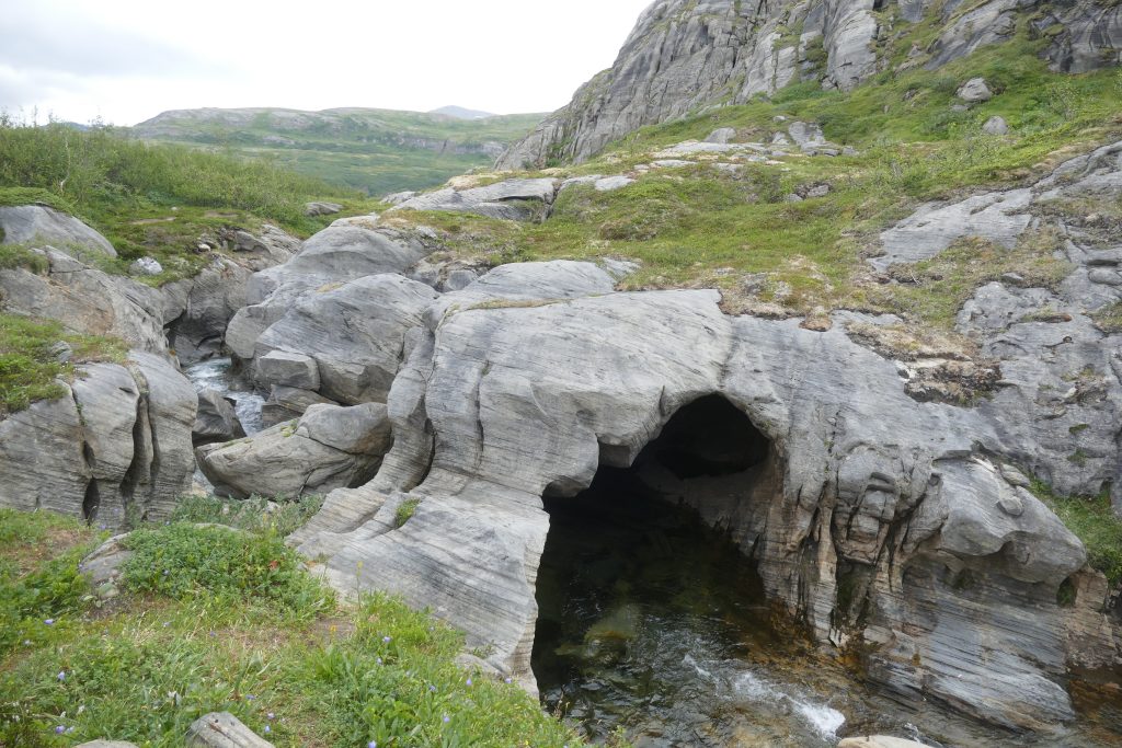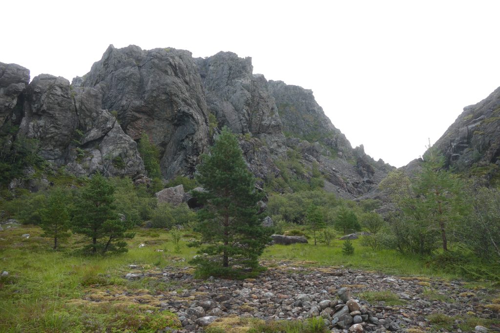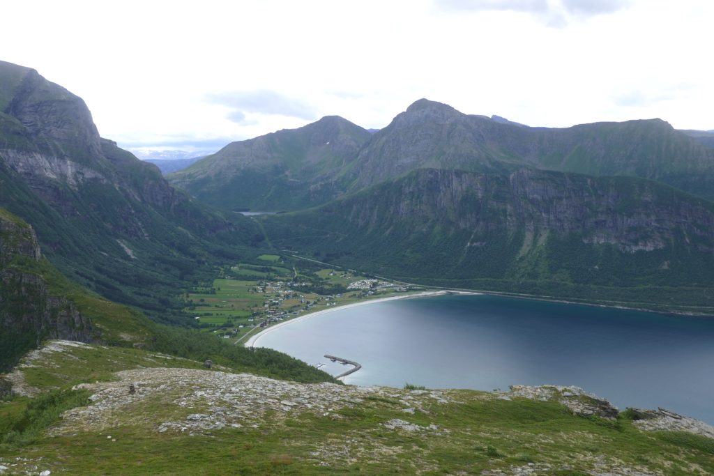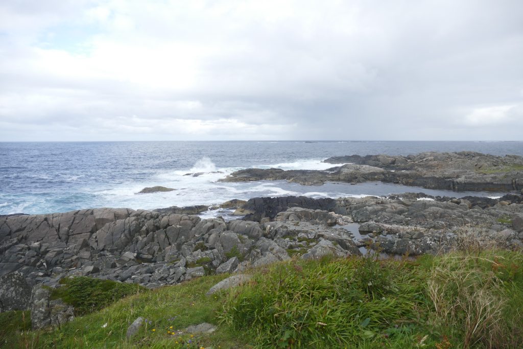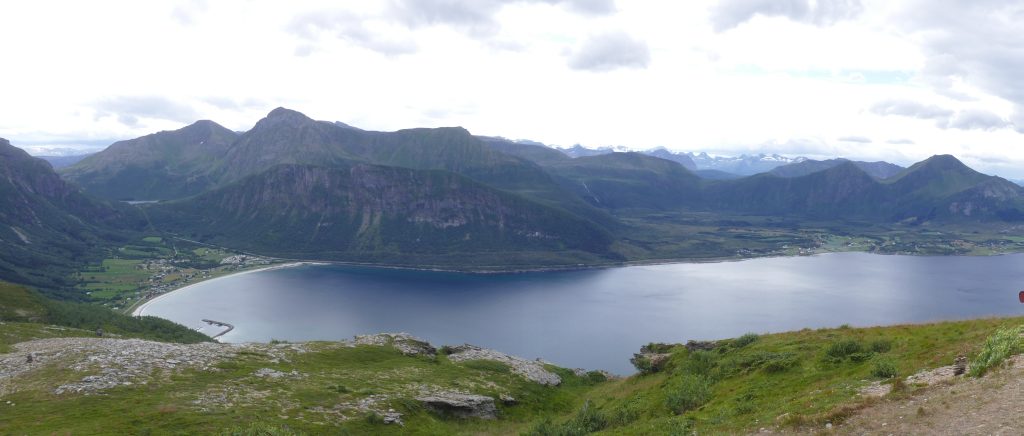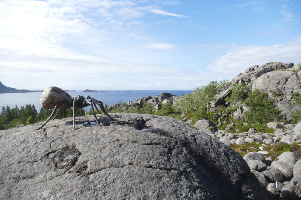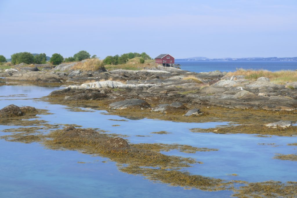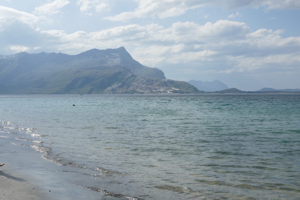 Regen, Regen und noch mehr Regen. Einen kurzen Moment haben wir am Morgen die Hoffnung, dass es sich bessert. Doch nein, wir gehen nicht auf den Meekknoken, der sich in Wolken hüllt. Die steile Abfahrt ist nun zu bewältigen. Wir fahren weiter um die Insel Averøy bis nach Kårvåg und zum ersten Rastplatz auf dem Atlanterhavsvegen, eine der atemberaubendsten Straßen der Welt. An der Geitøy-Brücke haben wir einen schönen Panoramablick auf den Schärengarten. Ein Angelsteg führt unter die Brücke, wo gerade das Wasser mit mächtigen Strudeln in den Atlantik zurückfließt. Sonne und Regen wechseln sich heute ständig ab. Ein Höhepunkt des Atlanterhavsvegen ist die Storseisundrua die größte und beeindruckendste der 8 Brücken auf der Landschaftsroute, die sich wie verdreht zwischen die Inseln zwängt. Auf der Insel Eldhusøya nehmen wir den Aussichtsweg, der entlang der Küste führt. Zu beiden Seiten der Myrbærholmbrua wurden Angelerstege eingerichtet. Wir gehen hinunter zu den Klippen und sehen den Anglern zu, wie sie im starken Gezeitenstrom Dorsch, Pollack, Makrele und Seelachs aus dem Meerwasser holen. Hier muss auch ein altes Schiffswrack liegen, doch finden wir den Parkplatz mit der Aussicht darauf nicht. Wir fahren noch ein Stück weiter zum nächsten Rastplatz, Hågå in Vevang, wo wir den Küstenwanderweg mit den Teilen von weißen Säule laufen. Wie zufällig angespült liegen die Teile der griechischen Säulen zwischen den Klippen. Die Landschaftsroute verläuft weiter entlang von Küstenkulturlandschaften und hügeligen Heidelandschaften bis zu den kahlen Bergkuppen am rauen, offenen Küstenabschnitt Hustadvika. Hier befindet sich der Rastplatz Farstadsanden mit den nördlichsten Dünen der Welt und einer geschützten Sanddünenlandschaft. Wir nehmen den Weg am Strand entlang und folgen der Küstenlinie bis zum Leuchtturm Nordneset. Im Anschluss fahren wir ca. 6 km zurück zu einem kleinen Parkplatz mit schöner Aussicht auf die Schären in der Nähe unseres morgigen Wanderziels.
