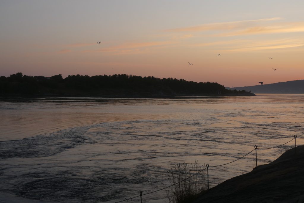Dichter Nebel liegt über der Landschaft. Wir fahren weiter in Richtung Süden, immer entlang des Randsfjorden und erreichen nach ca. 100 km Hønefossen. Der Wasserfall Hønefossen, an dem wir vorbeikommen, hat seit 1337, als der erste industrielle Betrieb in Form einer Mühle entstand, große Bedeutung für die Entwicklung der Stadt und für ihre Einwohner.