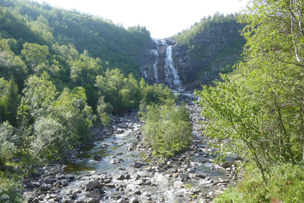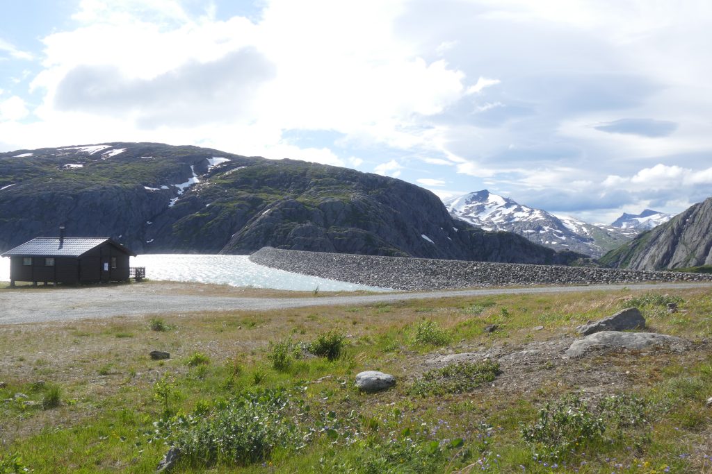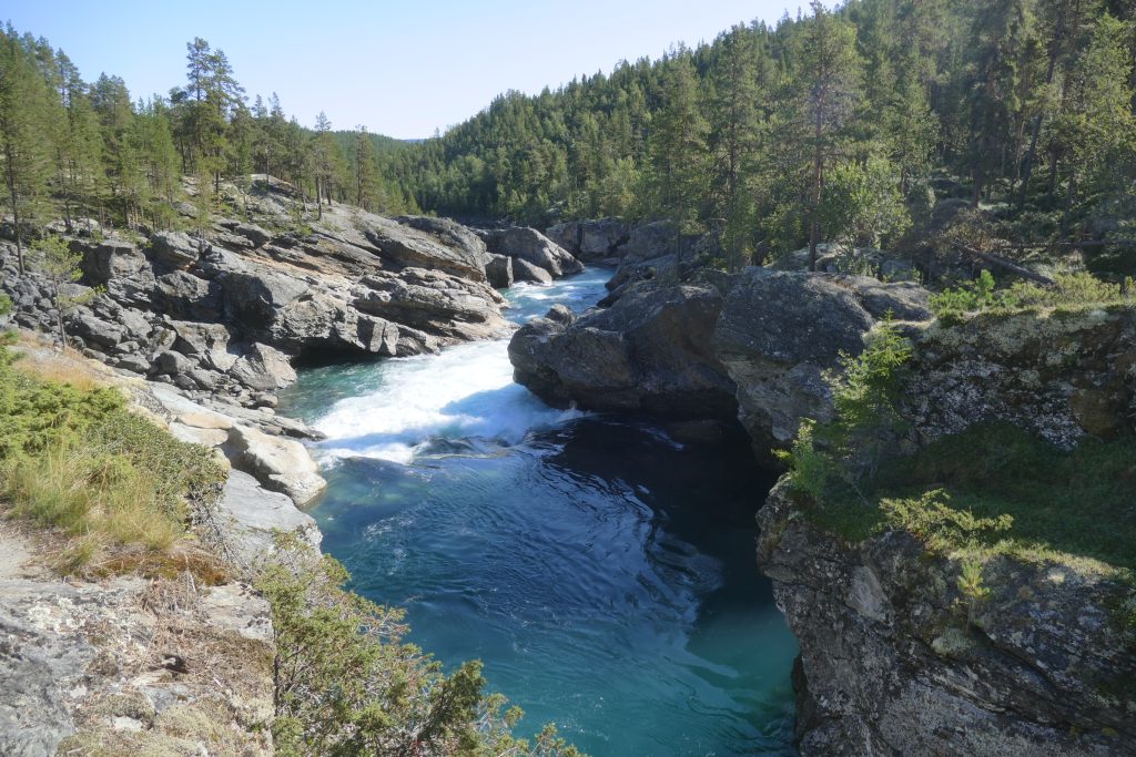 Die Nacht war laut zwischen Hauptstraße und Bahngleisen. Heute ist ein Bilderbuchwetter mit blauem Himmel, wie man ihn sich wünscht. Wir fahren in westliche Richtung bewusst auf einer kleinen Straße und kommen durch eine traumhafte Landschaft mit Bauernhöfen und sanften Hügeln, immer entlang des unwirklich türkisfarbenen Flusses. Vor Otta biegen wir auf die 257 ab bis Randsverk. Unterwegs halten wir an der 1941 geweihten Heidal Kirke. Dann folgen wir der Fv15 und sind nach wenigen Kilometern bei Hindsæter auf der Hochebene am Einfallstor in den Jotunheimen-Nationalpark auf der Landschaftsroute Valdresflye. Am Schild Ridderspranget parken wir an der Schlucht. Der Fluss Sjøa hat hier eine tiefe Schlucht durch Sjødalen gegraben, über die, so die Legende, ein mittelalterlicher Ritter sprang, um seine Geliebte zu retten. Noch vor dem ersten Rastplatz der Landschaftsroute kommen wir zu einem Wanderparkplatz. Wir sehen uns die Wanderung Hulderstigen an und machen uns auf den ca. 5,5 km langen einfachen Weg, auf dem sich 16 Hinweisschilder, auch in Deutsch, mit interessanten Informationen über lokale Themen befinden. Einen schönen Blick haben wir bei unserer Wanderung auf den 2258 m hohen Besshø. Da wir hier nicht über Nacht bleiben können, fahren wir noch 2 km weiter zu einem kleinen Parkplatz direkt am Fluss.
