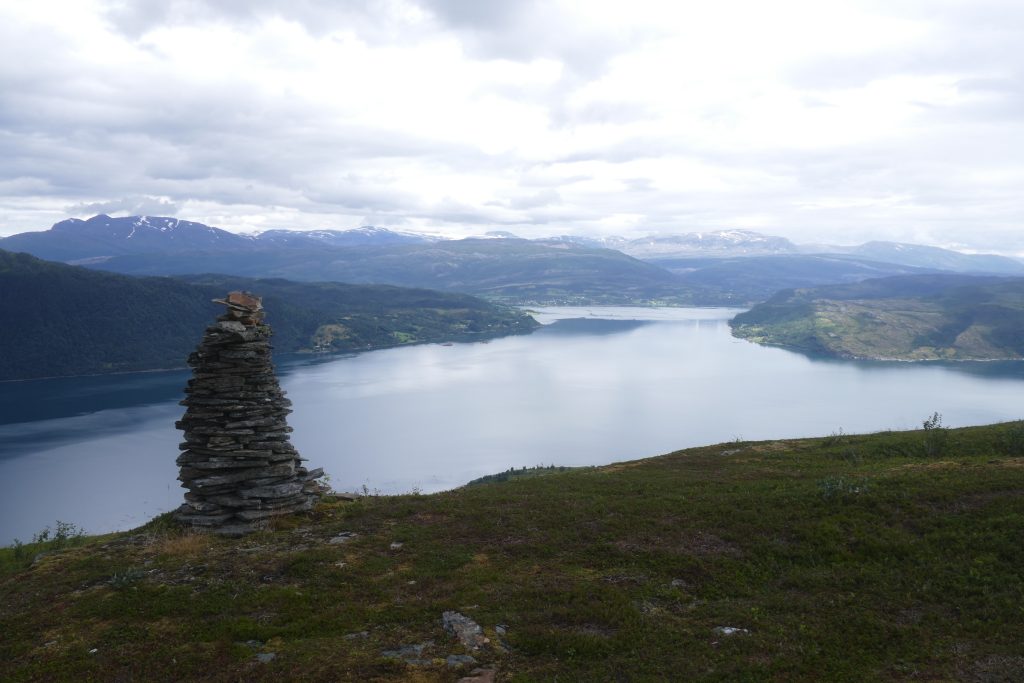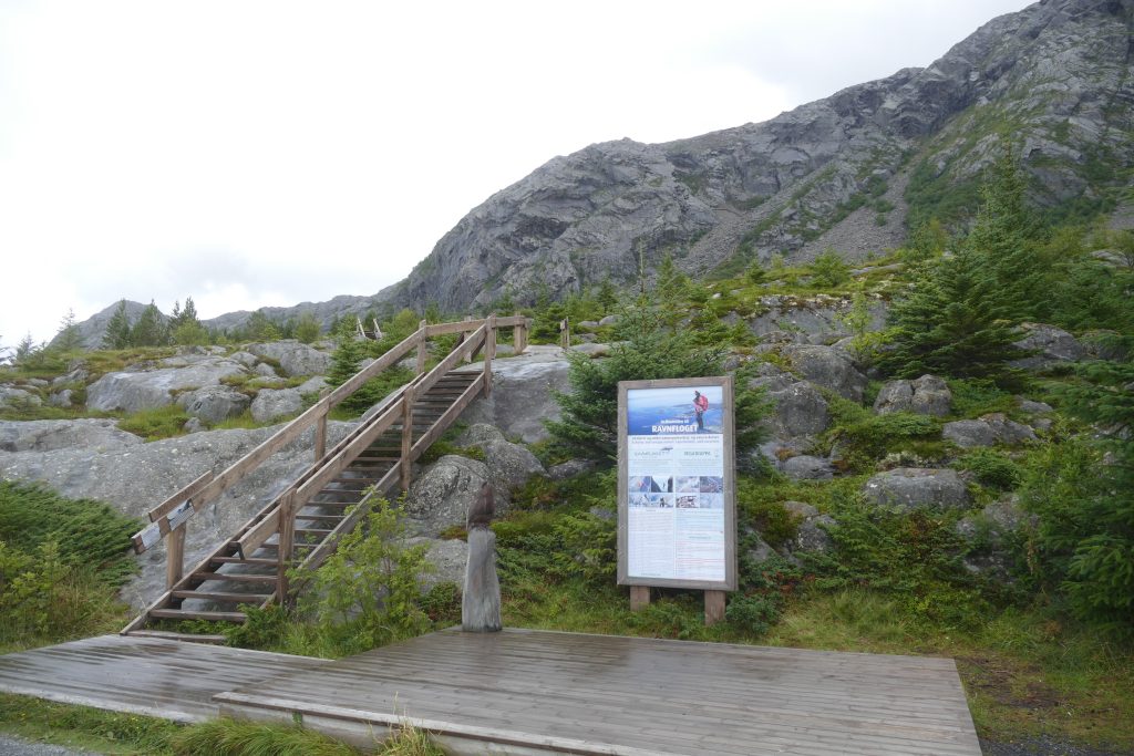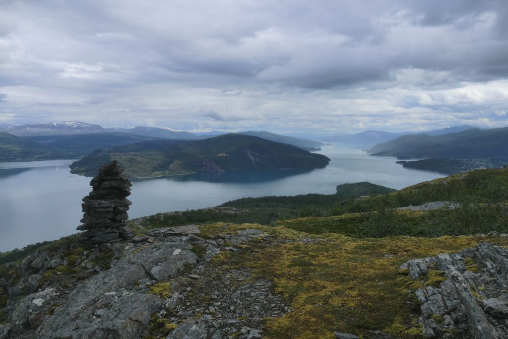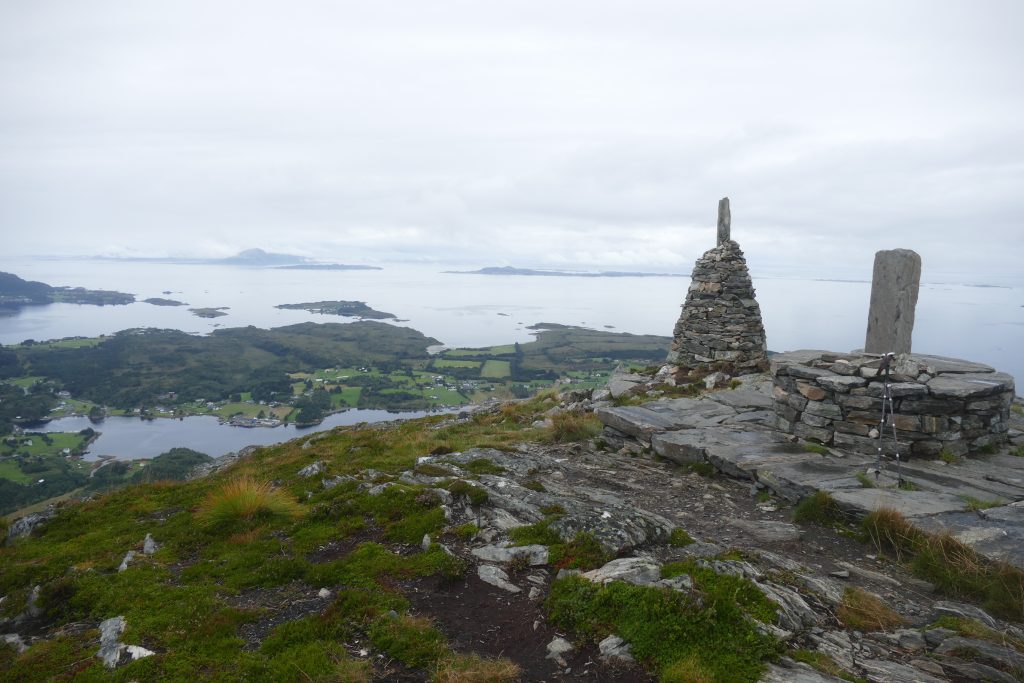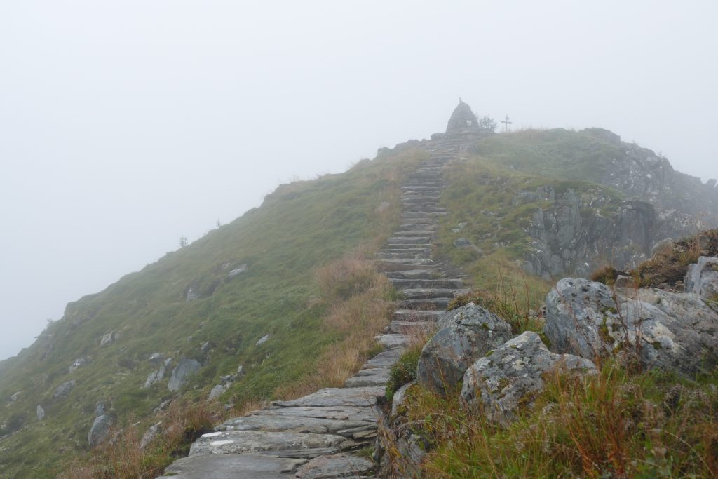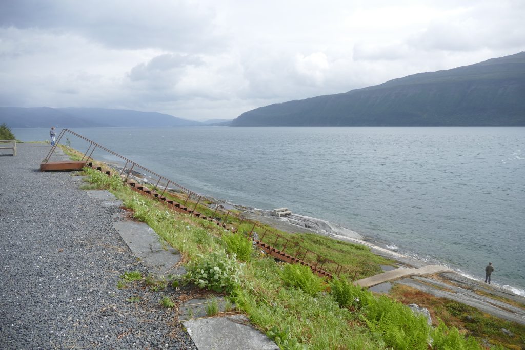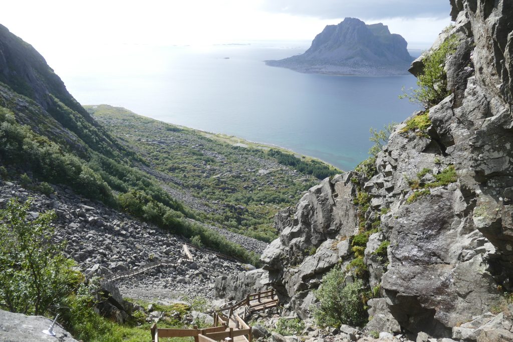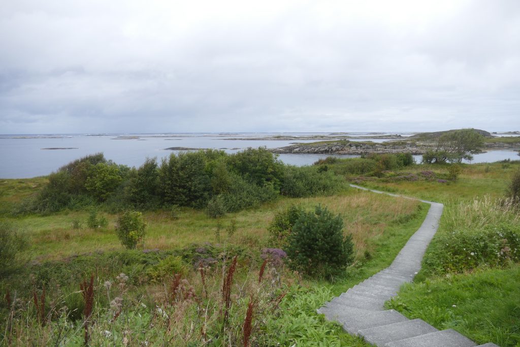Am Morgen haben wir noch die Hoffnung, die Wanderung auf den Sjurvarden zu machen. Doch dann kommt ein kräftiger Regenguss und die Berge sind weg. So fahren wir weiter auf dem Atlanterhavsvegen zum Aussichtspunkt in Askevågen am Ende einer Mole und dem Aussichtspunkt in Kjeksa in der Nähe von Bud. Vom Strand schauen wir auf das Fahrwasser und das offene Meer mit einer der berüchtigsten Meeresabschnitte Norwegens, der Hustadvika. In Bud machen wir einen kurzen Halt, um uns das Kystfort Ergan aus dem 2. Weltkrieg anzusehen. Da es immer noch trüb und mit 10° C recht kalt ist, fahren wir weiter bis zum Fähranleger Mordal nach Solholmen auf die Insel Otrøya und weiter in Richtung Midsund, bis zum Parkplatz in Rakvåg auf der Nordseite der Insel. Hier ist der Ausgangspunkt für die Midsundtrappene. 2200 Stufen, die von Sherpas aus Nepal errichtet wurden, führen auf den 659 m hohen Rørsethornet. Der Regen hat eine Pause eingelegt und so machen wir uns auf den Aufstieg. Wir erreichen den ersten Aussichtspunkt mit einer Steinpyramide und das Ziel kommt in Sicht. Oben angekommen zieht sich der Himmel rasch zu und wir können unsere Mühen nicht genießen. So hatten wir uns das nicht gedacht. Dann fängt es auch noch an zu regnen und wir beeilen uns wieder nach unten zu kommen.