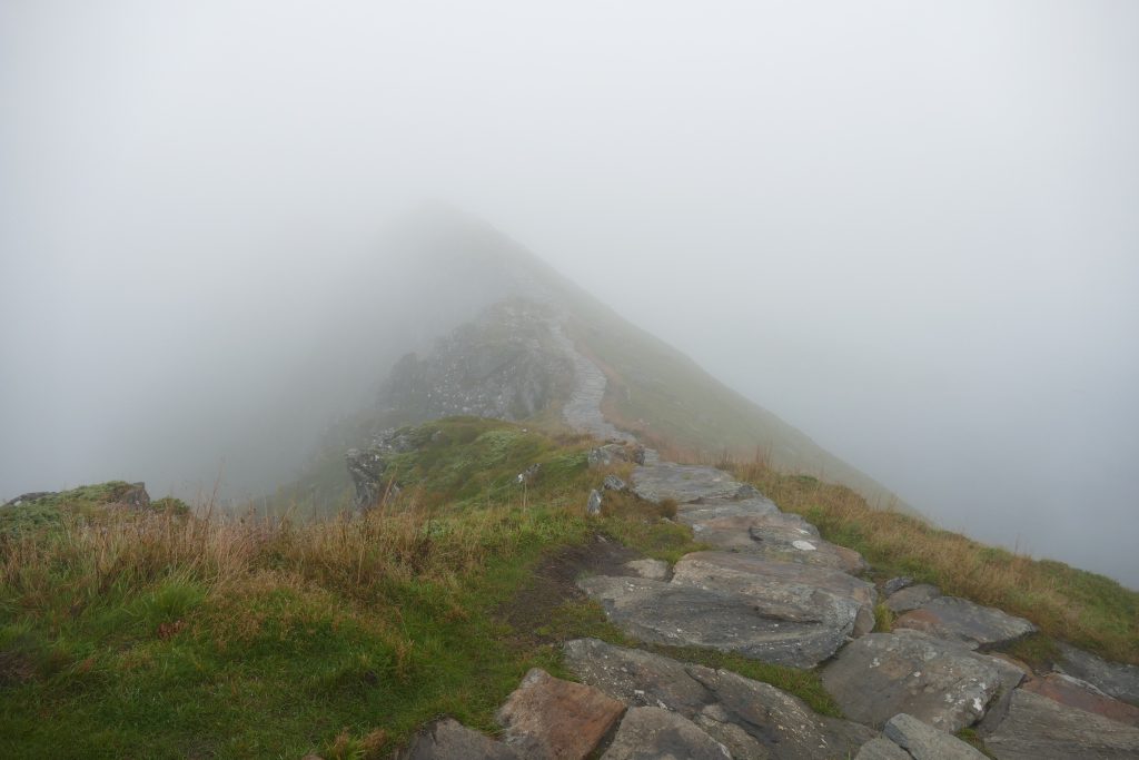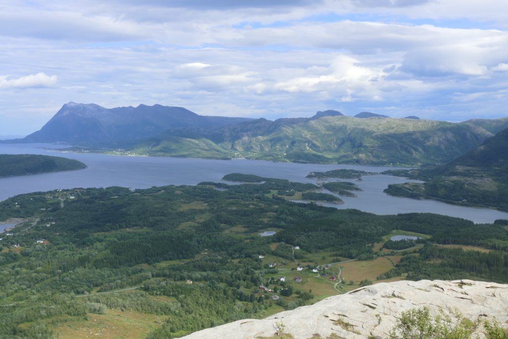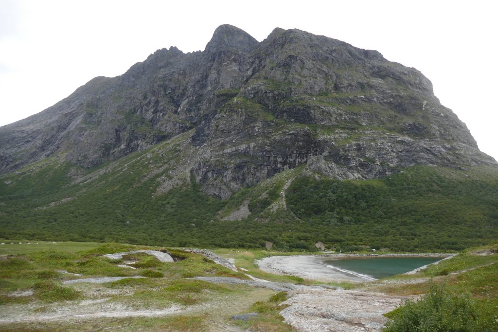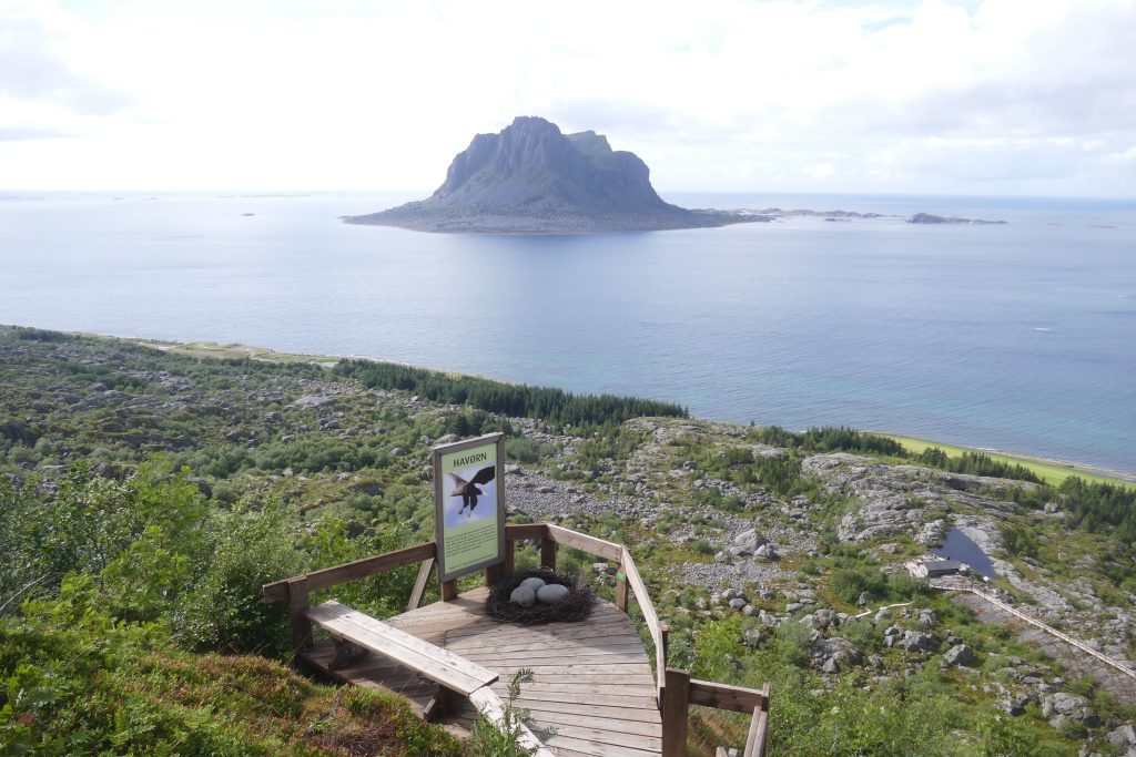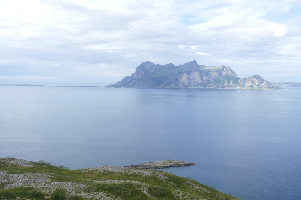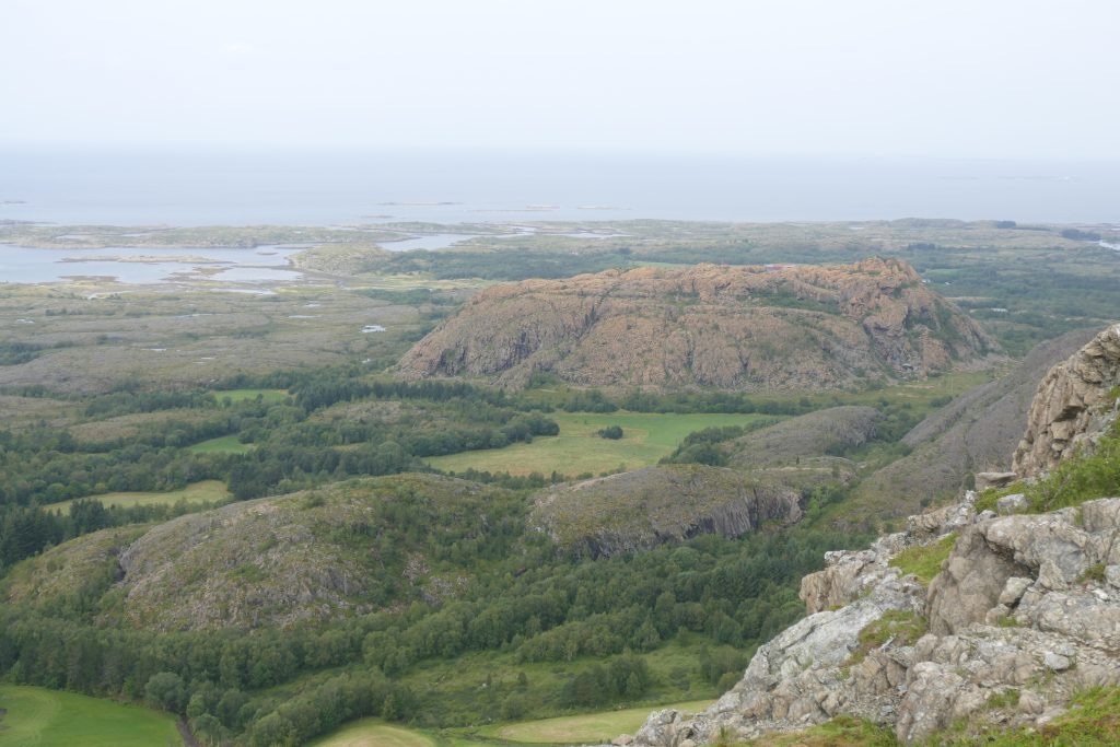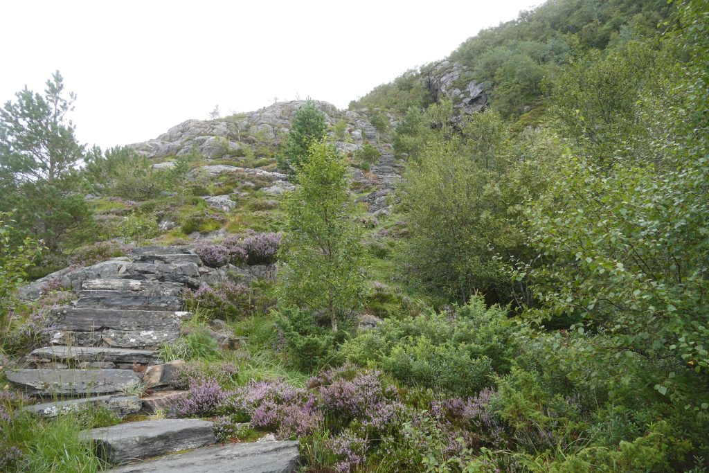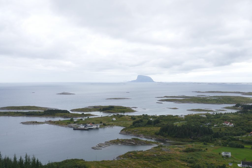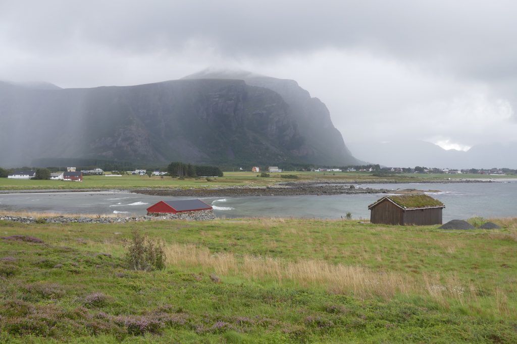 Am Morgen haben wir noch die Hoffnung, die Wanderung auf den Sjurvarden zu machen. Doch dann kommt ein kräftiger Regenguss und die Berge sind weg. So fahren wir weiter auf dem Atlanterhavsvegen zum Aussichtspunkt in Askevågen am Ende einer Mole und dem Aussichtspunkt in Kjeksa in der Nähe von Bud. Vom Strand schauen wir auf das Fahrwasser und das offene Meer mit einer der berüchtigsten Meeresabschnitte Norwegens, der Hustadvika. In Bud machen wir einen kurzen Halt, um uns das Kystfort Ergan aus dem 2. Weltkrieg anzusehen. Da es immer noch trüb und mit 10° C recht kalt ist, fahren wir weiter bis zum Fähranleger Mordal nach Solholmen auf die Insel Otrøya und weiter in Richtung Midsund, bis zum Parkplatz in Rakvåg auf der Nordseite der Insel. Hier ist der Ausgangspunkt für die Midsundtrappene. 2200 Stufen, die von Sherpas aus Nepal errichtet wurden, führen auf den 659 m hohen Rørsethornet. Der Regen hat eine Pause eingelegt und so machen wir uns auf den Aufstieg. Wir erreichen den ersten Aussichtspunkt mit einer Steinpyramide und das Ziel kommt in Sicht. Oben angekommen zieht sich der Himmel rasch zu und wir können unsere Mühen nicht genießen. So hatten wir uns das nicht gedacht. Dann fängt es auch noch an zu regnen und wir beeilen uns wieder nach unten zu kommen.