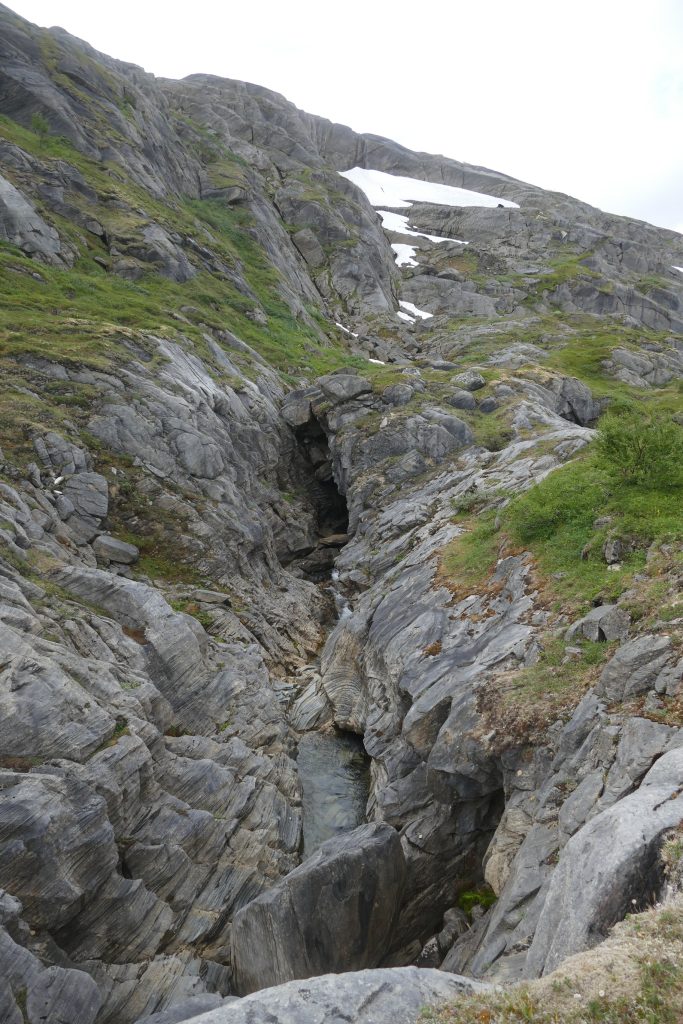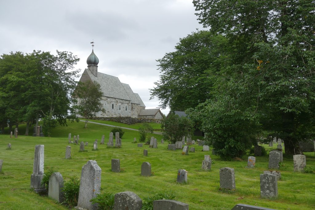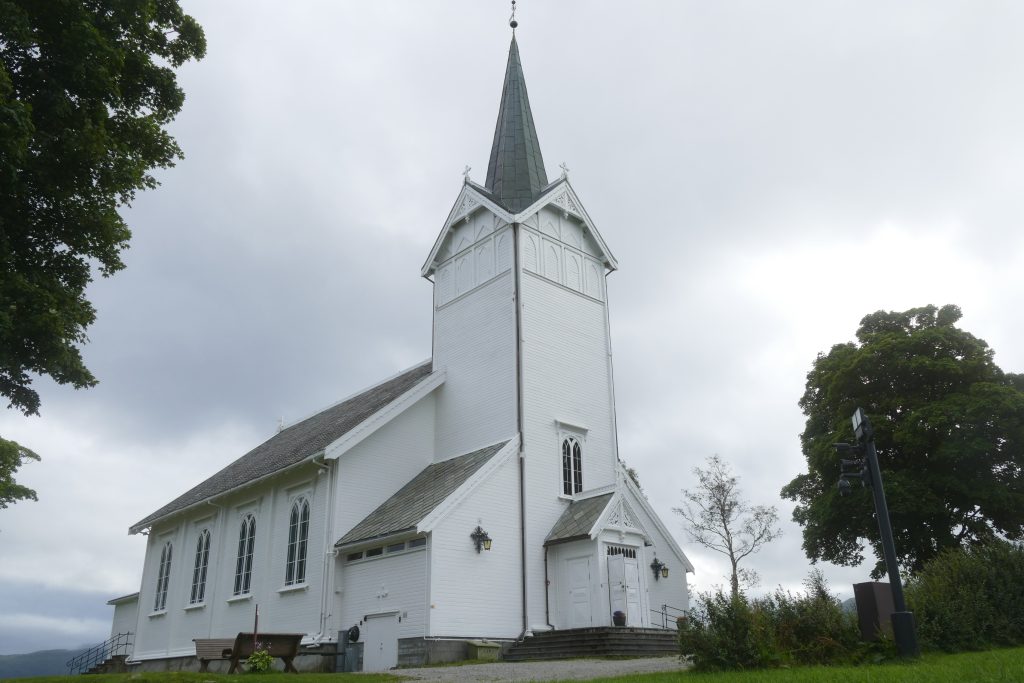 Da wir 2023 bereits in Kristiansund waren, fahren wir weiter. Zuerst durch den 5779 m langen Atlanterhavstunnelen, mit 10 % Gefälle geht es hinunter auf 250 m unter dem Meeresspiegel und wieder hinauf auf die Atlantikstraße. Wir biegen jedoch schon bald auf die südliche Straße der Insel Averøy ab. Durch ein Schild werden wir auf die Stavkirke Kvernes aus dem 13. Jahrhundert aufmerksam und legen einen kurzen Stopp ein. Dann folgen wir der Straße bis Mork. Am kleinen Schild mit der Aufschrift „Stikk UT“ biegen wir auf eine abenteuerliche, sehr steile, kleine Schotterstraße zum Wanderparkplatz Meekknoken ab.