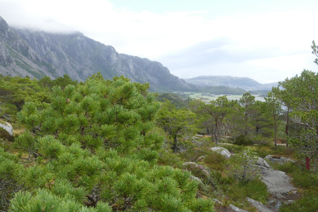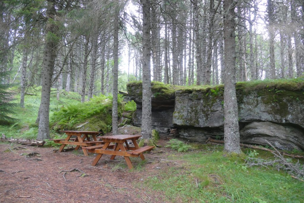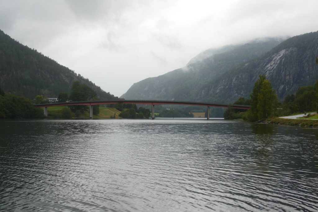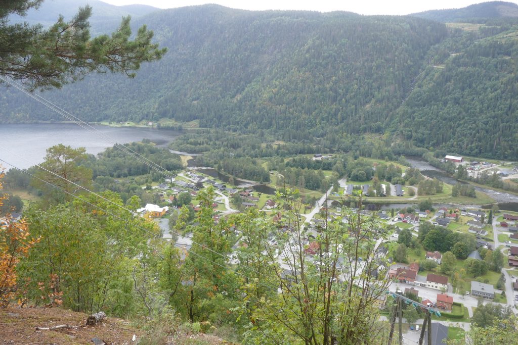 Der Wald trieft vor Nässe, als wir weiter fahren. Die Landschaft verändert sich und immer mehr Berge kommen hinter den Wolken zum Vorschein. Der Telemarkkanal endet in Dalen und wird von Passagierschiffen angefahren. Bevor wir den Ort erreichen, machen wir Halt an der Eidsborg Stavkyrkje. In Dalen starten wir zur Wanderung Rui Plassen, einer 1 km langen Wanderung. Über eine Treppe mit 810 Stufen, die Sherpas aus Nepal erbaut haben, überwinden wir 200 Höhenmeter bis zu den Spuren der Rui-Mädchen aus Dalen. Wir erreichen den ehemaligen Bauernhof und nehmen den steil ansteigenden Weg in Richtung Eidsborg. Am Aussichtspunkt Hamaren haben wir einen schönen Blick auf Dalen. Kurz darauf brechen wir jedoch die Wanderung ab, da der Weg zu rutschig wird. Nach der Wanderung suchen wir noch einen Platz für die Übernachtung, was sich etwas schwierig gestaltet. Doch dann finden wir einen Platz direkt am Fluss.