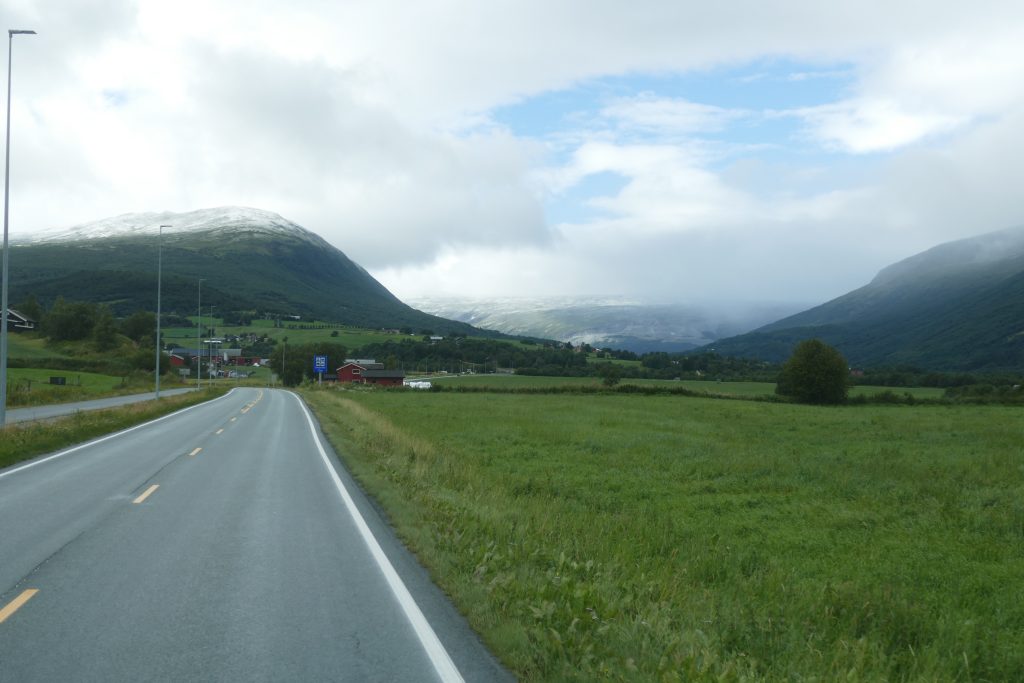 Wir fahren zum kleinen Parkplatz, wo die Wanderung auf den Digergubben beginnt. Es regnet und es ist noch keine Pause abzusehen. Zwecklos, wir fahren um die Insel herum zur Fähre und setzen über nach Mordal. In Molde erledigen wir Einkäufe und fahren weiter, zuerst auf der E39 dann biegen wir auf die Fv62 ab. Am Sundalsfjorden entlang erreichen wir Sunndalsøra. Nun ist guter Rat teuer. Eigentlich sollte es jetzt in das schönste Tal Norwegens nach Innerdalen gehen, wo es eine Wanderung gibt. Wir sehen nochmal auf den Wetterbericht – Regen die nächsten Tage. Also geht es weiter auf der Fv70 durch das wunderschöne Sunndalen. Rechts und links der Straße stürzen unzählbare Wasserfälle von den fast senkrechten Felswänden. Dann weitet sich das Tal und wir klettern auf 650 Höhenmeter hinauf. Rechts der Straße sehen wir in ein fantastisches Tal hinunter. Wir fahren an uralten Bauernhäusern vorbei in Richtung Oppdal in Trollheimen. Unterwegs war kein geeigneter Parkplatz zu finden. So nehmen wir in Oppdal den Parkplatz am Sportzentrum.