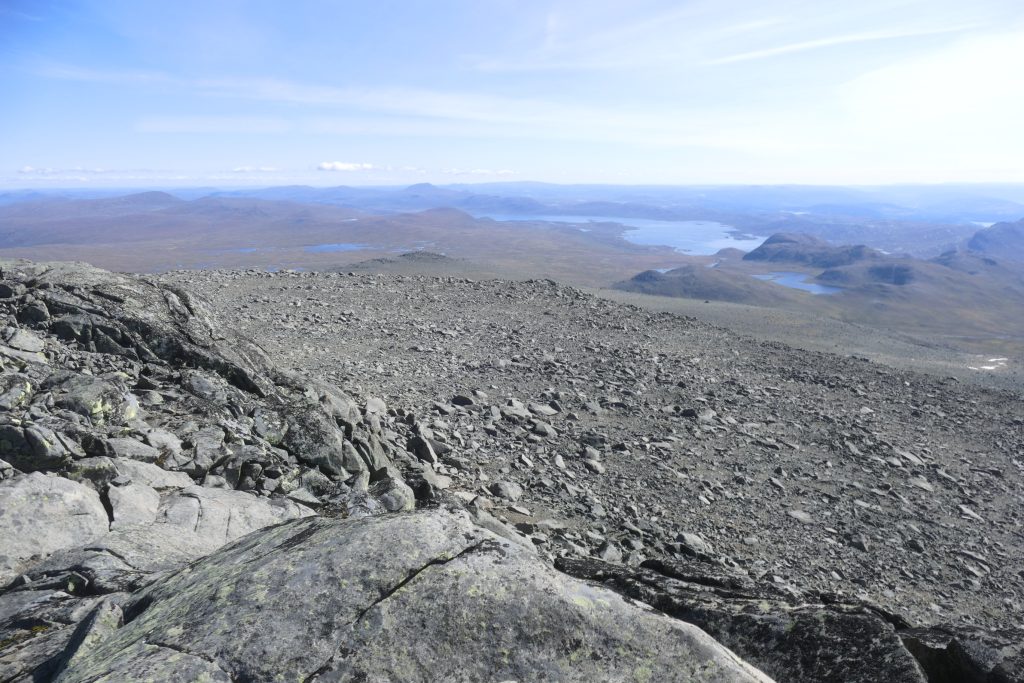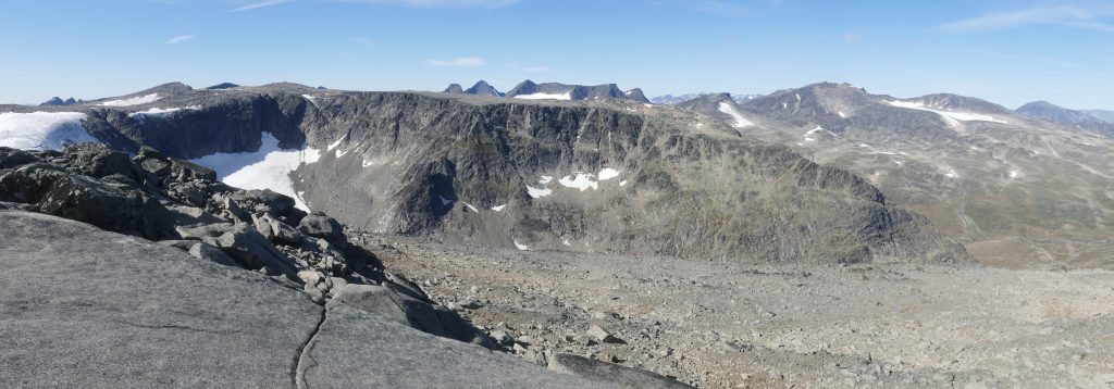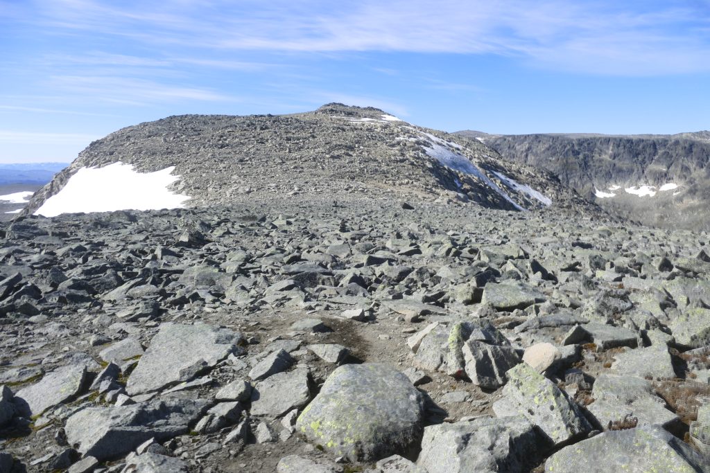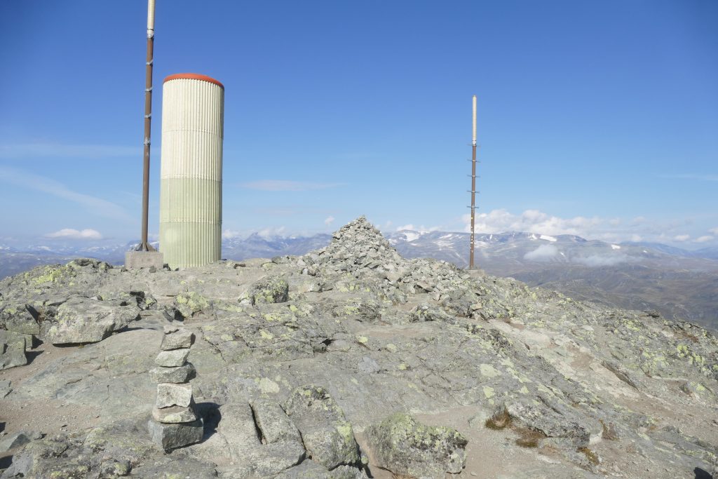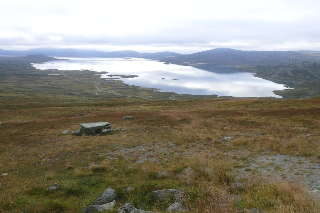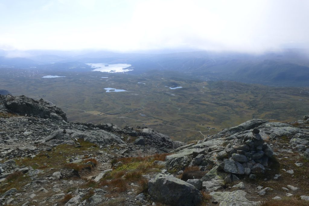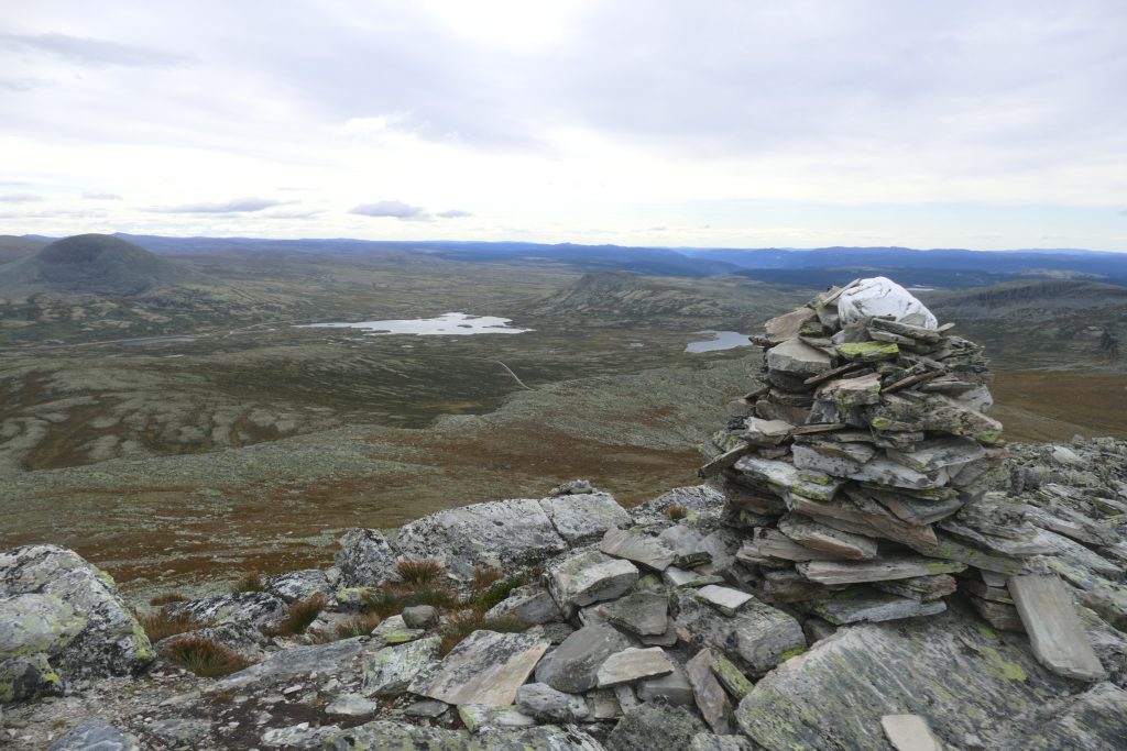 Am Morgen liegt Raureif über der Landschaft und Nebelschwaden hängen in den Bergen. Es war die Nacht – 0,5° C. Die Sonne schickt schon ihre wärmenden Strahlen als wir auf der Landschaftsroute Valdresflye mit weitläufigem Blick auf die Berge weiterfahren. Am ansteigenden Abschnitt der Straße am Gebirgspass zwischen Valdres und Gudbrandsdalen befindet sich der Rastplatz Vargebakkane. Wir machen kurz Fotostopp, da kein freier Parkplatz vorhanden ist. Die beiden Steinblöcke „Rock on Top of Another Rock“ symbolisieren die typischen Steinpyramiden, die als Wegmarkierung dienen. Der höchste Punkt der Valdresflye ist der Flye 1389 mit einem grandiosen 360° Rundumblick. Wir sehen die Wanderschilder und entscheiden uns für den Aufstieg auf den Rasletinden. Es ist zwar eine rote Tour, doch da sie linear ist, kann man ja jederzeit abbrechen. Der Rasletinden ist der einfachste 2000er-Gipfel in Norwegen. Das Bilderbuchwetter passt. Zunächst überqueren wir die karge und steinige Fjell Landschaft, teilweise über Holzstege bis zu einer Anhöhe mit einem Bergsee, in dem sich die Schneefelder des Rasletinden spiegeln. Dann müssen wir über ein grün schimmerndes Geröllfeld, bevor der eigentliche Anstieg über Felsbrocken mit kurzer Kraxelei beginnt. Das Bergpanorama der Riesen von Jotunheimen ist imposant, sodass wir immer wieder Fotostopps einlegen. Wir springen von Felsen zu Felsen und suchen die Markierungen. Der Weg will kein Ende nehmen. Als wir ein Stück flaches Gelände überqueren, sehen wir den Gipfel in noch ca. 1 km vor uns liegen. Dann ist es geschafft und wir genießen den berauschenden 360° Panoramablick über die Berge mit Schnee- und Eisfeldern. Welch Glück wir heute auch mit dem Wetter haben. Dann treten wir den Rückweg auf demselben Weg an uns kommen nach ca. 6 Stunden und fast 18 km wieder zum Parkplatz. Da hier campen verboten ist, fahren wir ca. 2 km zurück und parken mit Blick auf Rock on Top of Another Rock.
