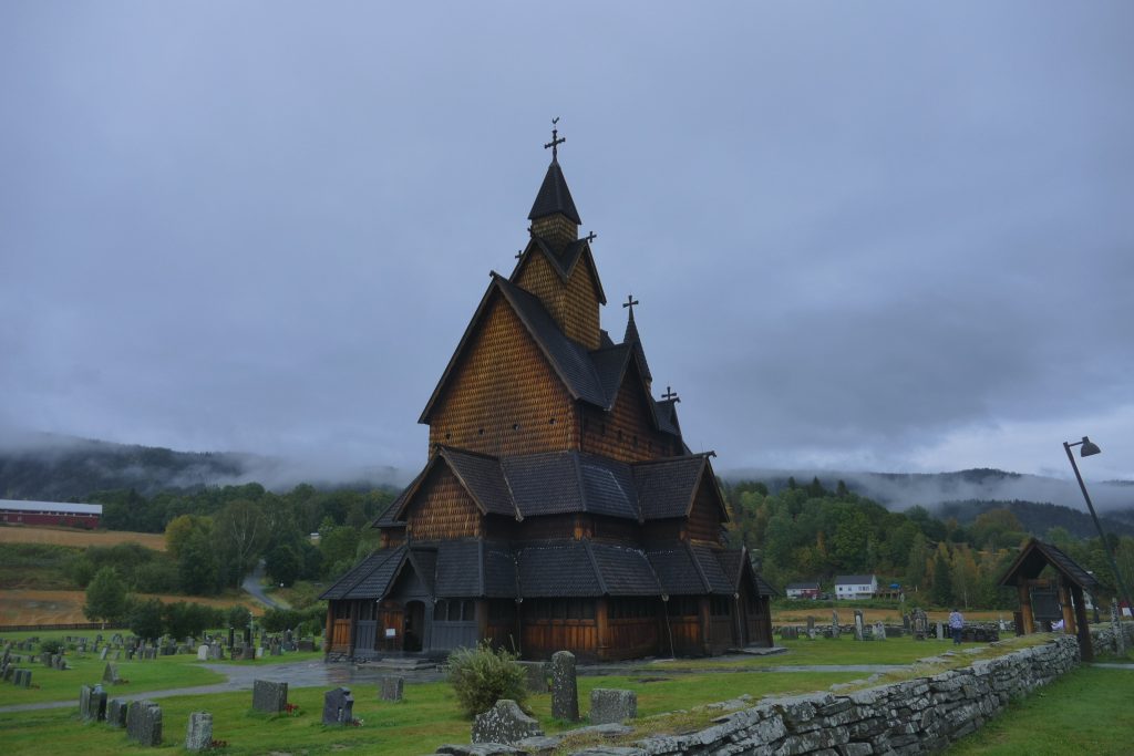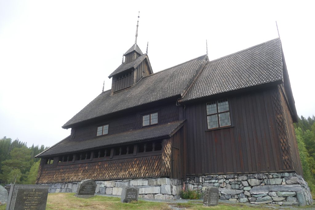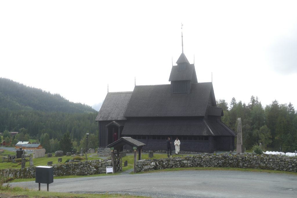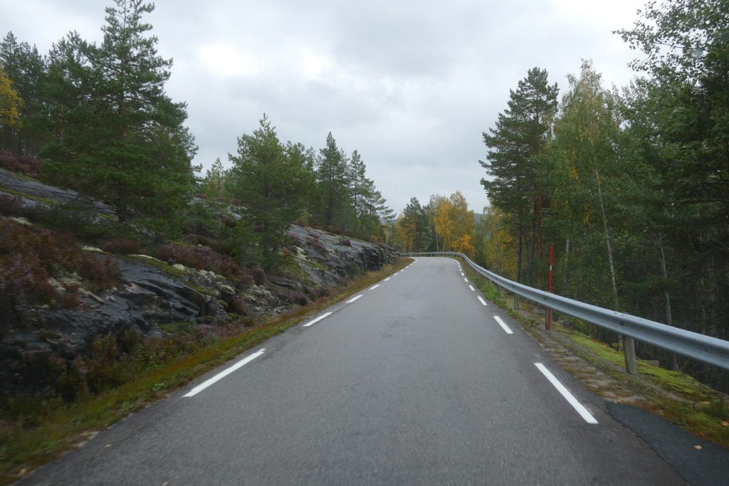 Innerhalb von zwei Tagen hat der Herbst mit seiner schönen Laubfärbung eingesetzt. Da sich heute kräftige Regengüsse mit Nieselregen abwechseln, fahren wir weiter in die Region Telemark. Diese Region erstreckt sich zwischen Oslo und Kristiansand mit der Hochebene des Hardangergebirges. Einziger Stopp, den wir heute einlegen, ist bei der größten Stabkirche Norwegens, der Heddal Stavkyrkje aus dem 12. Jahrhundert. Nachdem wir den Ort Notodden passiert haben, suchen wir uns einen der wenigen Parkplätze an der Straße 361.