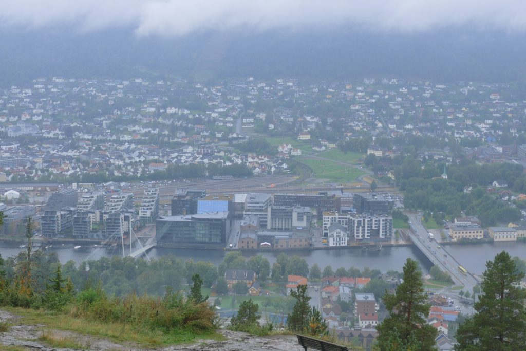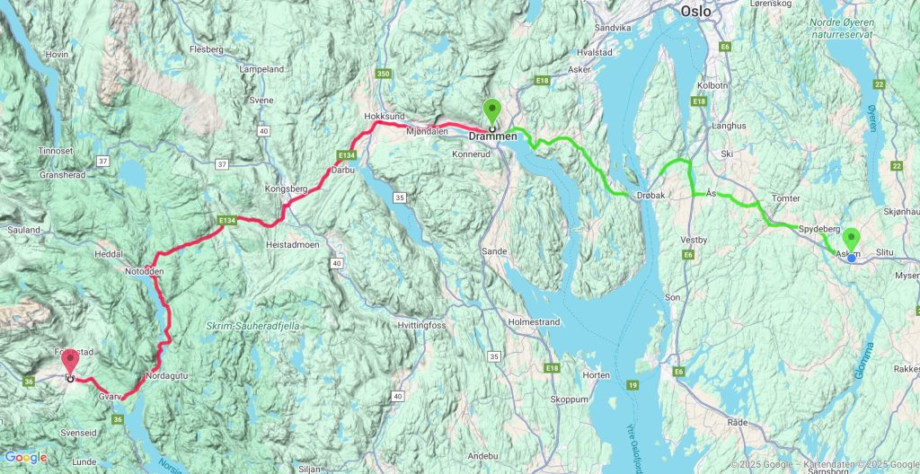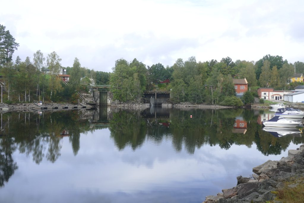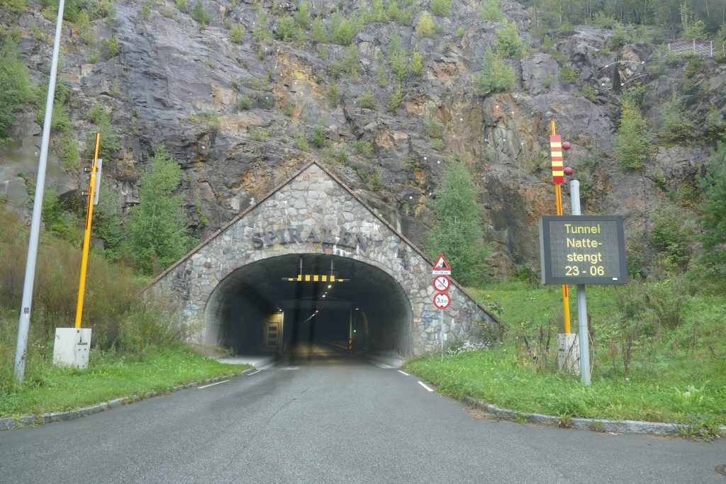 Auch die für heute geplante Wanderung zum markanten Felsen Gygrestolen fällt ins Wasser. Es will einfach nicht aufhören zu regnen. Wir geben uns geschlagen und beschließen nach Schweden zu fahren. Doch zuerst schließen wir die Runde durch die Region Telemark ab und fahren über Notodden, Kongsberg und Hokksund nach Drammen zum berühmtesten Wahrzeichen der Stadt. In den Berg Bragernesåsen wurde ein Spiraltunnel mit sechs Kehren auf einer Länge von 1650 m getrieben. Er überwindet 163 Höhenmeter bis auf dem Spiraltoppen und wurde 1961 eingeweiht. Wir passen eine kurze Regenpause ab, um einen Blick auf Drammen zu werfen. Dann fahren wir weiter auf der E134 und passieren den Oslofjordtunelen mit 7,1 km Länge. Hinter Drøbak überqueren wir die E6 und wir sehen nach Tagen mal wieder die Sonne bei 22° C. Einen Stellplatz finden wir in Askim bei der Askimungdomsskole.