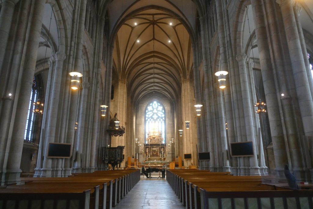 Am Morgen schauen wir uns den Dom von Skara, der 1150 eingeweiht wurde, an. Er ist im gotischen Stil erbaut und hat ein hohes, freies Rippengewölbe und große Fenster. Besonders ist der Altar aus Keramik. In Skara können wir noch Entsorgen und Wasser auffüllen. Dann fahren wir weiter nach Skövde in das Freizeitgelände Billingen. Wir wandern heute auf den Trollstigen, einem Wanderweg, der aus drei unterschiedlich langen Touren besteht. Er führt zuerst durch das Rhododendrontal und dann größtenteils durch Laub- und Nadelwald. Leider fehlen die Ausblicke. Einziger Höhepunkt ist die Aussicht von den Ryd-Höhlen mit den beeindruckenden Diabassäulen, die vom Berghang abgebrochen sind. Wir kommen am Skanskas Steinbruch vorbei und durch den Wald von Billingetrolets. Die Tour endet an der Trollgrotte. Wir sind gerade am Auto, als ein Gewitter aufzieht. Das begleitet uns mit Blitz, Donner und Starkregen bis nach Hjo. Hier wollten wir eigentlich in das beheizte Schwimmbad, müssen jedoch feststellen, dass das Guldkroksbadet bereits für die Saison geschlossen ist.