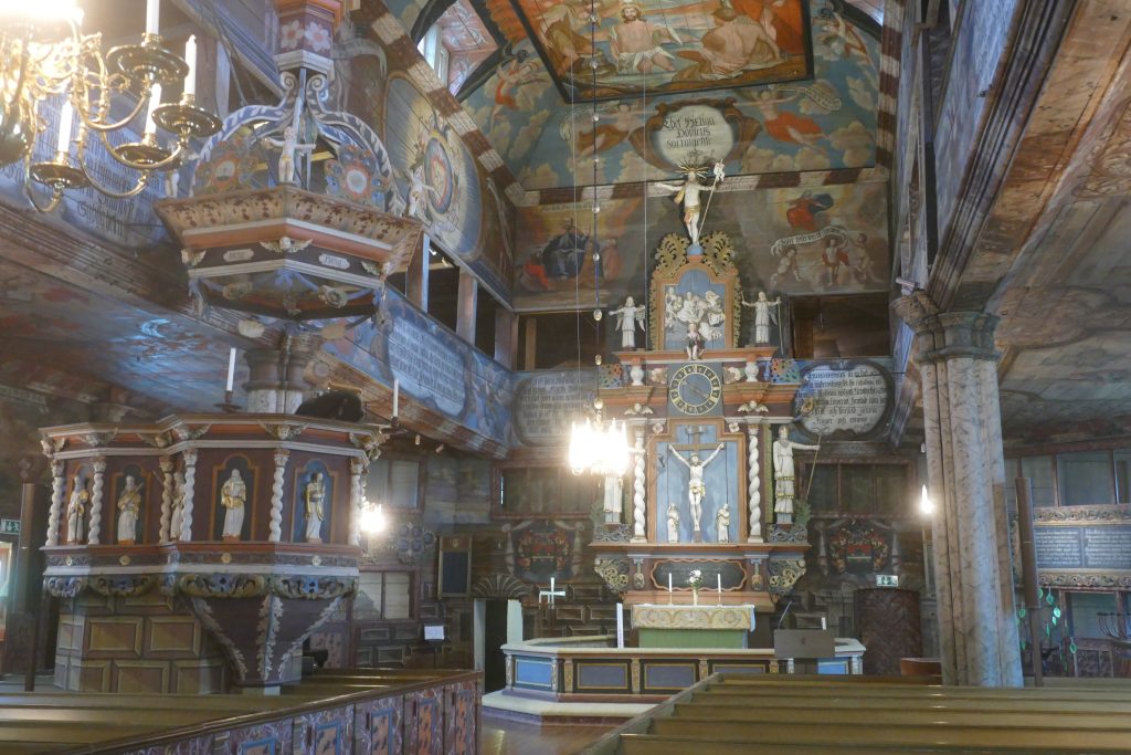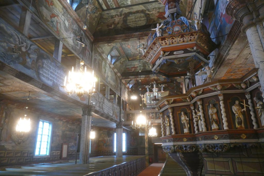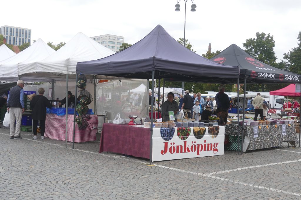 Wir fahren weiter, mit einem Halt an der Holzkirche Habo. Sie hat uns 2023 so gut gefallen, dass wir diesen Abstecher noch einmal mitnehmen. Einst war die Kirche ein Zentrum, zu dem sieben Straßen führten. Die Malereien im Innenraum bedecken die Wände und Decken und werden manchmal als Bauernbarock bezeichnet. Danach fahren wir weiter nach Jönköping. Im Stadtteil Västra Torget findet jeden Samstagvormittag der Wochenmarkt statt, den wir uns ansehen. Wir schlendern noch durch die Stadt und die Fußgängerzone, bevor wir uns einen Schlafplatz für die Nacht suchen. Dies gestaltet sich mal wieder schwierig. Wir fahren die Straße 30 bis Hok, wo es einen schönen Stellplatz am See gibt. Kaum angekommen, kommt eine Schwedin und sagt uns, dass wir hier Pause machen können, jedoch nicht übernachten dürfen. Nun gut, fahren wir weiter. Zum nächsten Platz führt ein schlammiger Waldweg, also weiter. Nach etwa 20 Kilometer sehen wir uns die Gamla Hjälmseryd Kyrka an. Der Parkplatz ist direkt an der Kirche und ist ebenfalls nicht geeignet. Nach weiteren 20 km kommt ein Rastplatz mit Toilette an einem See, den wir jetzt endlich nehmen.
