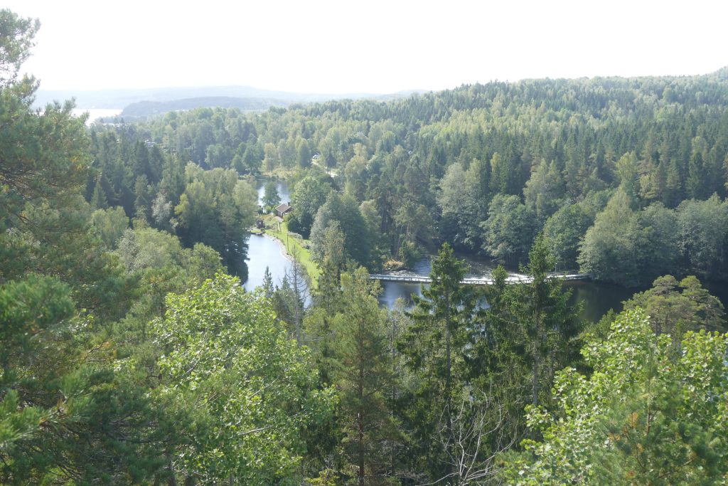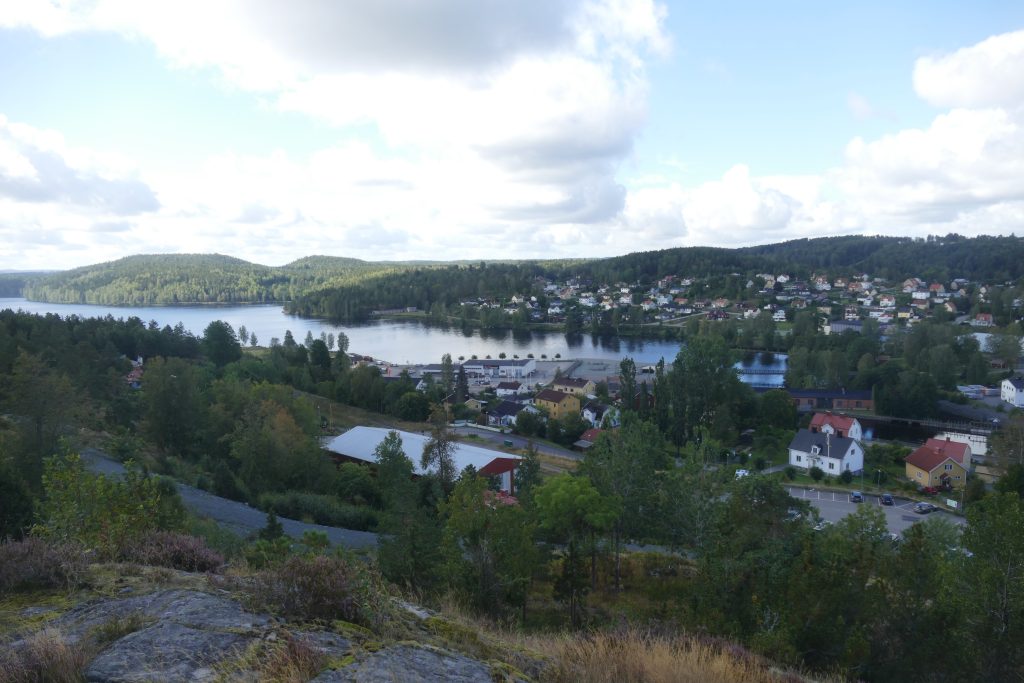 Unsere Fahrt geht weiter nach Bengtsfors. Wir parken am Bahnhof, wo man auch mit der Draisine fahren kann. Zuerst besichtigen wir den Gammelgården, West Schwedens größtes Freilichtmuseum. Von hier aus beginnt der Brända Berget-Wanderweg, ein wunderschöner Wanderweg im hügeligen Waldgebiet rund um den Bengtsbrohöljen-See, den wir unternehmen wollen. Wir wandern durch den Wald und kommen zu zwei Rastplätzen mit herrlicher Aussicht auf Bengtsfors und den See Bengtsbrohöljen. Wir nehmen auch die zusätzliche Schleife von ca. 2 km und kommen hinunter zu einer Schleuse am Dalsland Kanal. Der Weg führt nun direkt am Ufer des Sees entlang bis zu zwei weiteren Schleusen, wo wir wieder auf unseren Hauptweg treffen. Dann führt der Weg vom südlichen Ende von Höljerud auf der Lelångenbanan zurück nach Bengtsfors. Nach einer Pause wollen wir weiterfahren. Kommen jedoch nur bis zum Ende von Bengtsfors. Hier stehen wir eine gefühlte Ewigkeit in einem Stau und beschließen heute nur noch bis Linderud zu fahren.