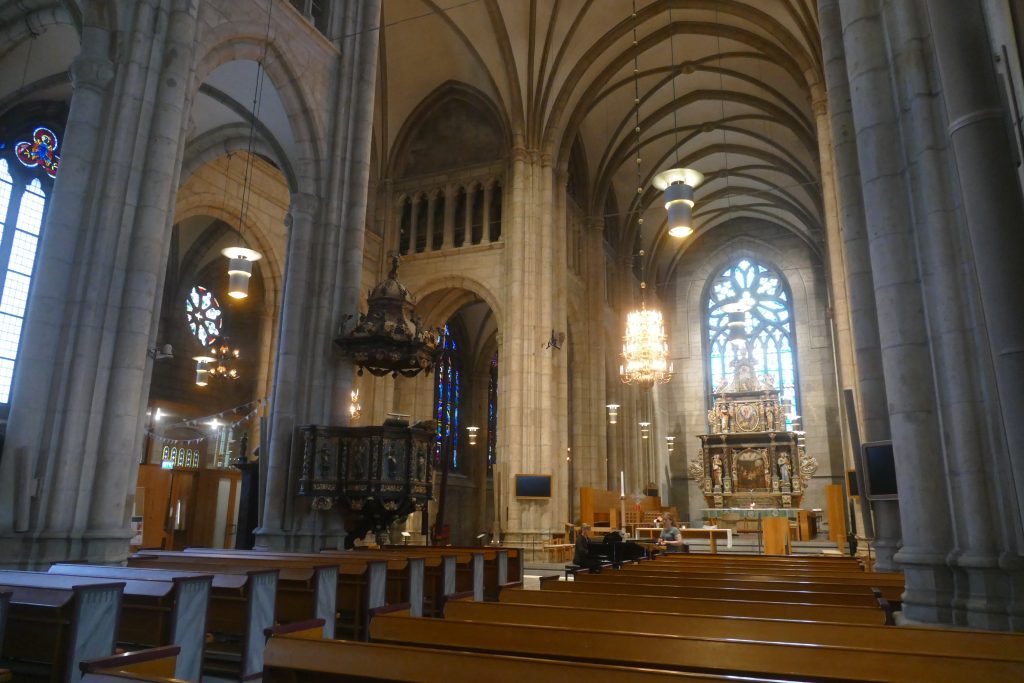 Am Morgen schauen wir uns den Dom von Skara, der 1150 eingeweiht wurde, an. Er ist im gotischen Stil erbaut und hat ein hohes, freies Rippengewölbe und große Fenster. Besonders ist der Altar aus Keramik. In Skara können wir noch Entsorgen und Wasser auffüllen. Dann fahren wir weiter nach Skövde in das Freizeitgelände Billingen. Wir wandern heute auf den Trollstigen, einem Wanderweg, der aus drei unterschiedlich langen Touren besteht. Er führt zuerst durch das Rhododendrontal und dann größtenteils durch Laub- und Nadelwald. Leider fehlen die Ausblicke. Einziger Höhepunkt ist die Aussicht von den Ryd-Höhlen mit den beeindruckenden Diabassäulen, die vom Berghang abgebrochen sind. Wir kommen am Skanskas Steinbruch vorbei und durch den Wald von Billingetrolets. Die Tour endet an der Trollgrotte. Wir sind gerade am Auto, als ein Gewitter aufzieht. Das begleitet uns mit Blitz, Donner und Starkregen bis nach Hjo. Hier wollten wir eigentlich in das beheizte Schwimmbad, müssen jedoch feststellen, dass das Guldkroksbadet bereits für die Saison geschlossen ist.