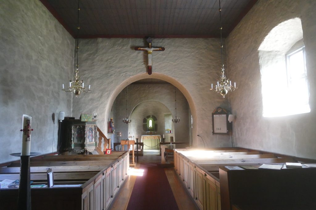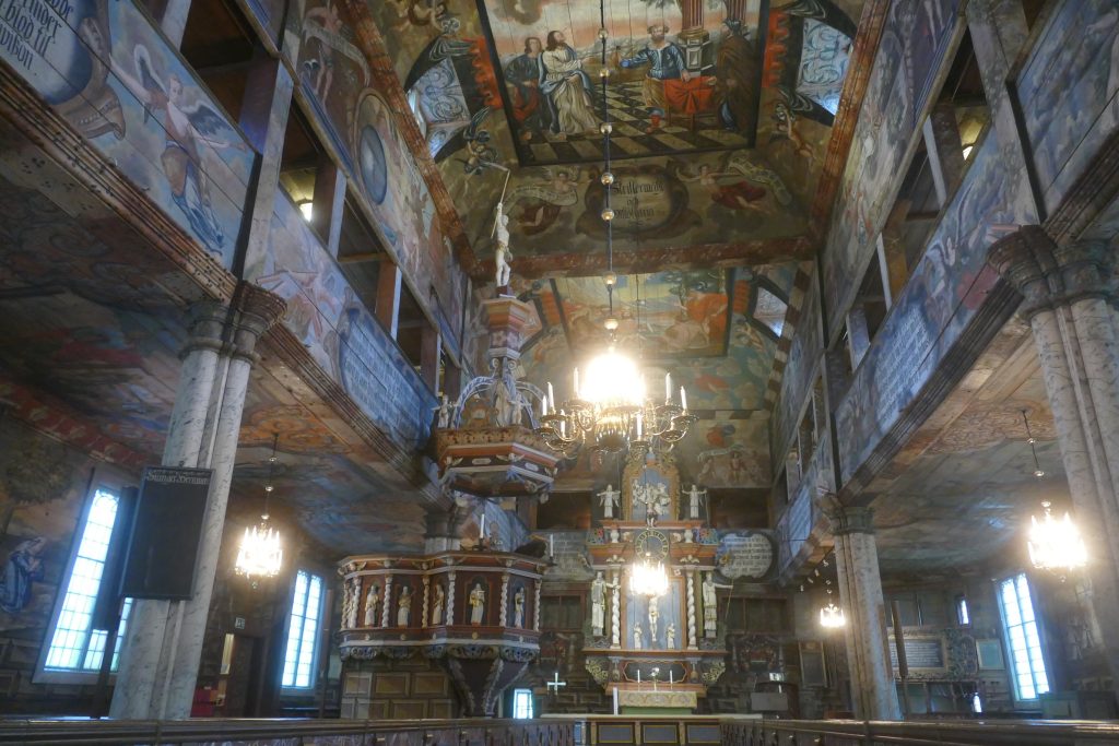 Wir fahren weiter, mit einem Halt an der Holzkirche Habo. Sie hat uns 2023 so gut gefallen, dass wir diesen Abstecher noch einmal mitnehmen. Einst war die Kirche ein Zentrum, zu dem sieben Straßen führten. Die Malereien im Innenraum bedecken die Wände und Decken und werden manchmal als Bauernbarock bezeichnet. Danach fahren wir weiter nach Jönköping. Im Stadtteil Västra Torget findet jeden Samstagvormittag der Wochenmarkt statt, den wir uns ansehen. Wir schlendern noch durch die Stadt und die Fußgängerzone, bevor wir uns einen Schlafplatz für die Nacht suchen. Dies gestaltet sich mal wieder schwierig. Wir fahren die Straße 30 bis Hok, wo es einen schönen Stellplatz am See gibt. Kaum angekommen, kommt eine Schwedin und sagt uns, dass wir hier Pause machen können, jedoch nicht übernachten dürfen. Nun gut, fahren wir weiter. Zum nächsten Platz führt ein schlammiger Waldweg, also weiter. Nach etwa 20 Kilometer sehen wir uns die Gamla Hjälmseryd Kyrka an. Der Parkplatz ist direkt an der Kirche und ist ebenfalls nicht geeignet. Nach weiteren 20 km kommt ein Rastplatz mit Toilette an einem See, den wir jetzt endlich nehmen.